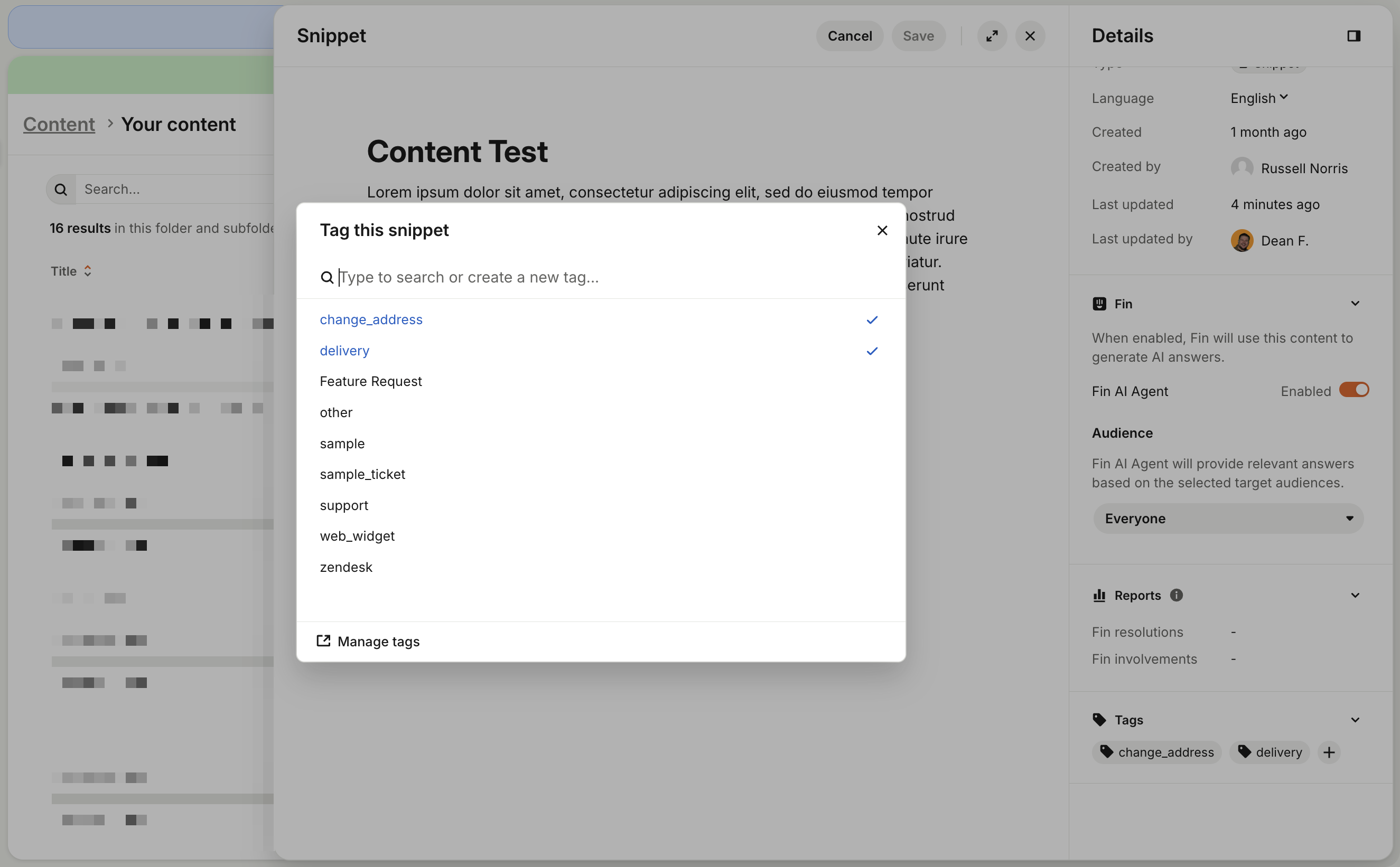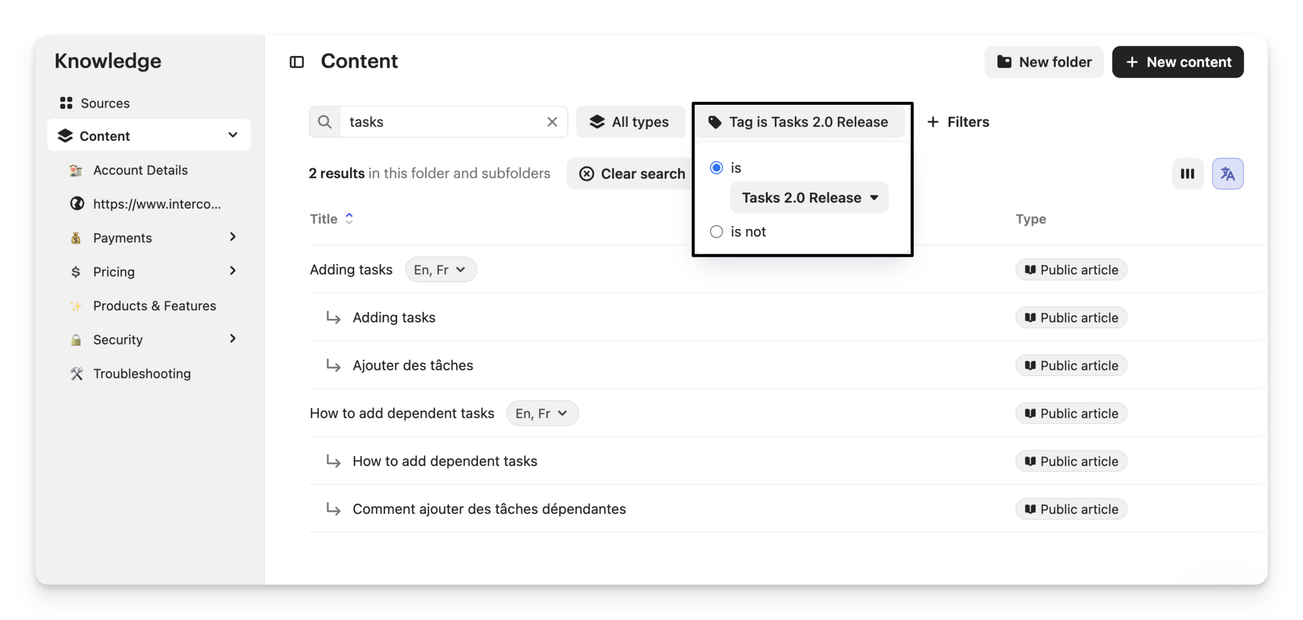 Filter by content type - Use tags such as "FAQ," "User Guide," or "Troubleshooting" to categorize content by its format or purpose. This helps teammates filter content based on their immediate needs, leading to faster problem-solving or learning.