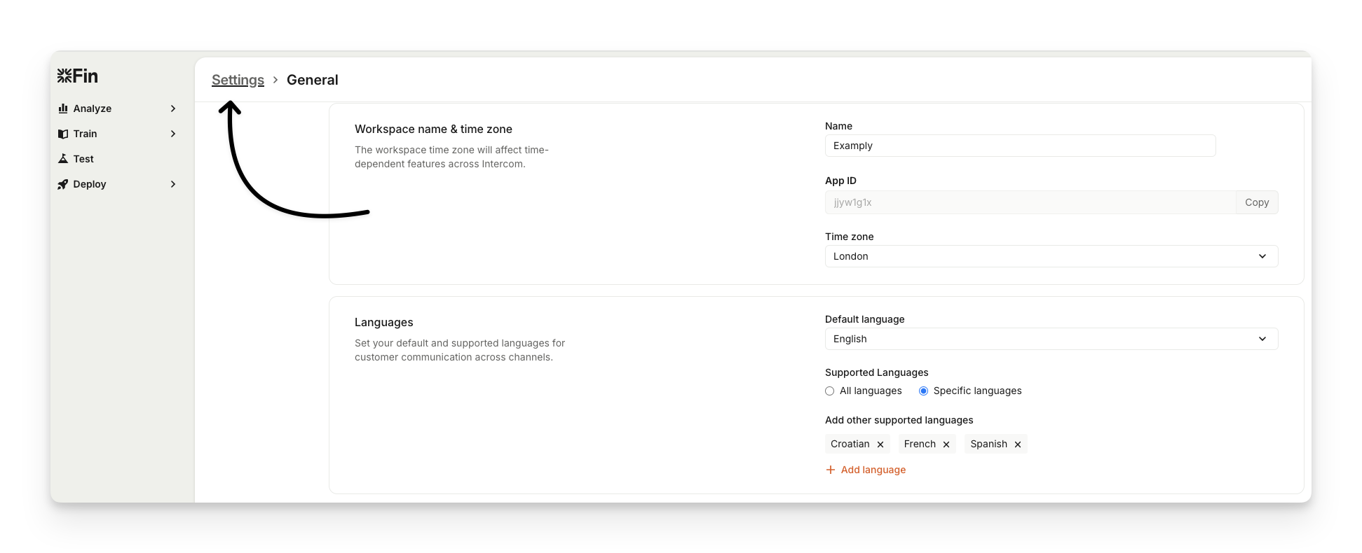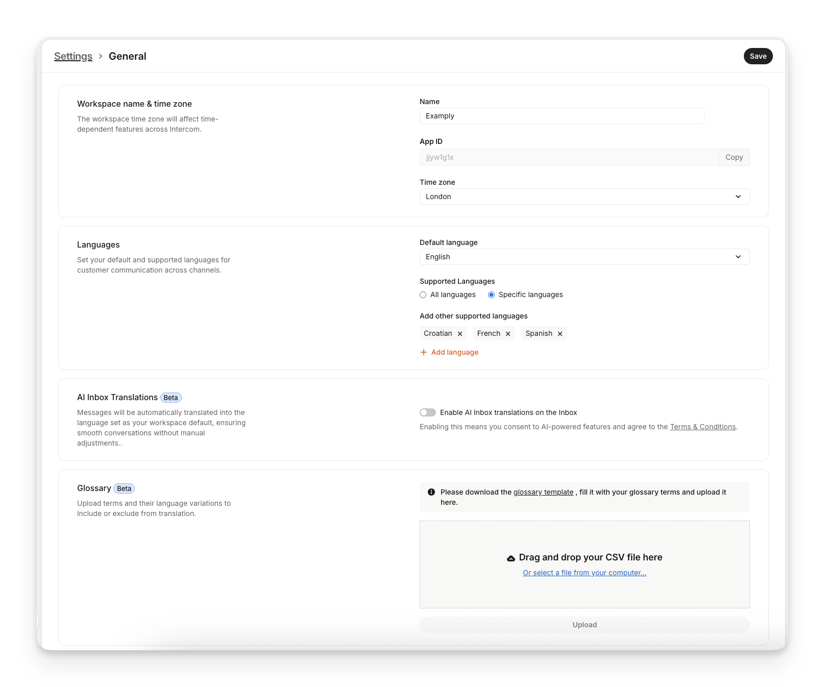 Set up and manage your multilingual settings including supported languages from Settings > Workspace > Multilingual.
