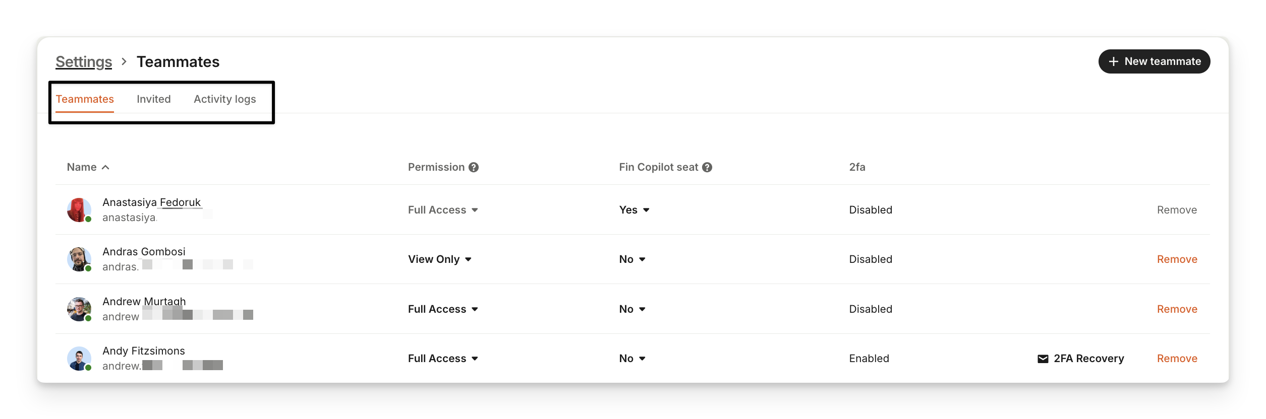 On the Teammates tab you can view a full list of your teammates with their email address. Here you can update their permissions (Full Access or View Only permission levels are available), enable or disable Sweo Copilot seat for each teammate. If you require two-factor authentication (2FA) when you sign in into your Intercom account, 2FA recovery code can be sent from this tab when needed. And here you can also add and remove teammates from the workspace.