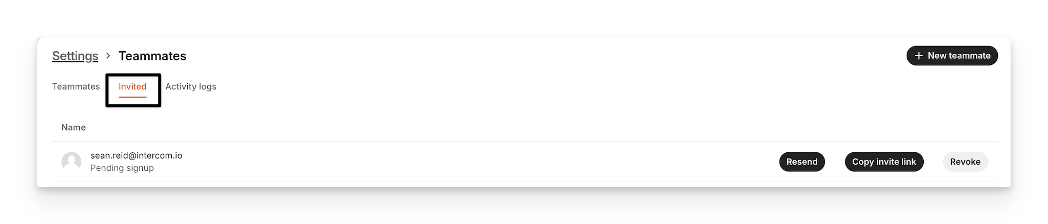 Invited tab will show you a list of your teammates with a pending signup. Once you add your teammates, they will be sent an email with an invitation to join your workspace, but you can also share their invite link directly with them by copying the invite link from, resend them an invitation or revoke it.