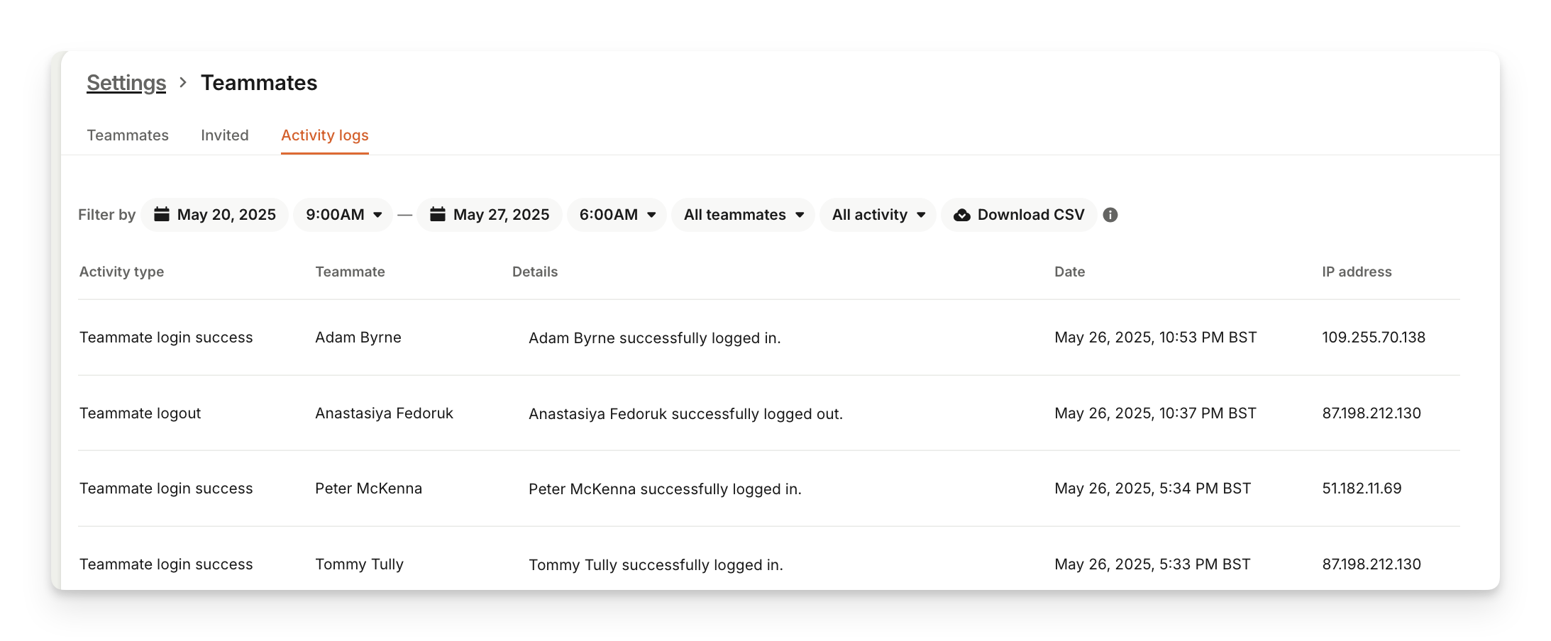 You can see the actions you and your teammates take in Intercom like setting messages live, logging in and more under Activity logs tab.