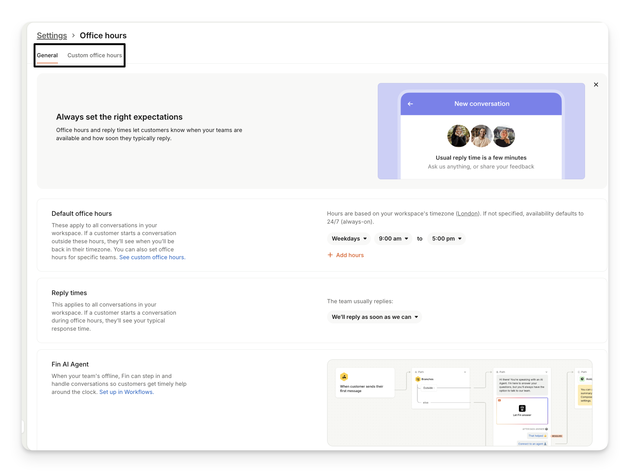 In Settings > Workspace > Office hours you can set up your workspace default office hours as well as hours for specific teams in Custom office hours tab. Here you can also specify your team reply times and set up workflows for Sweo AI Agent to step in when your team is offline.