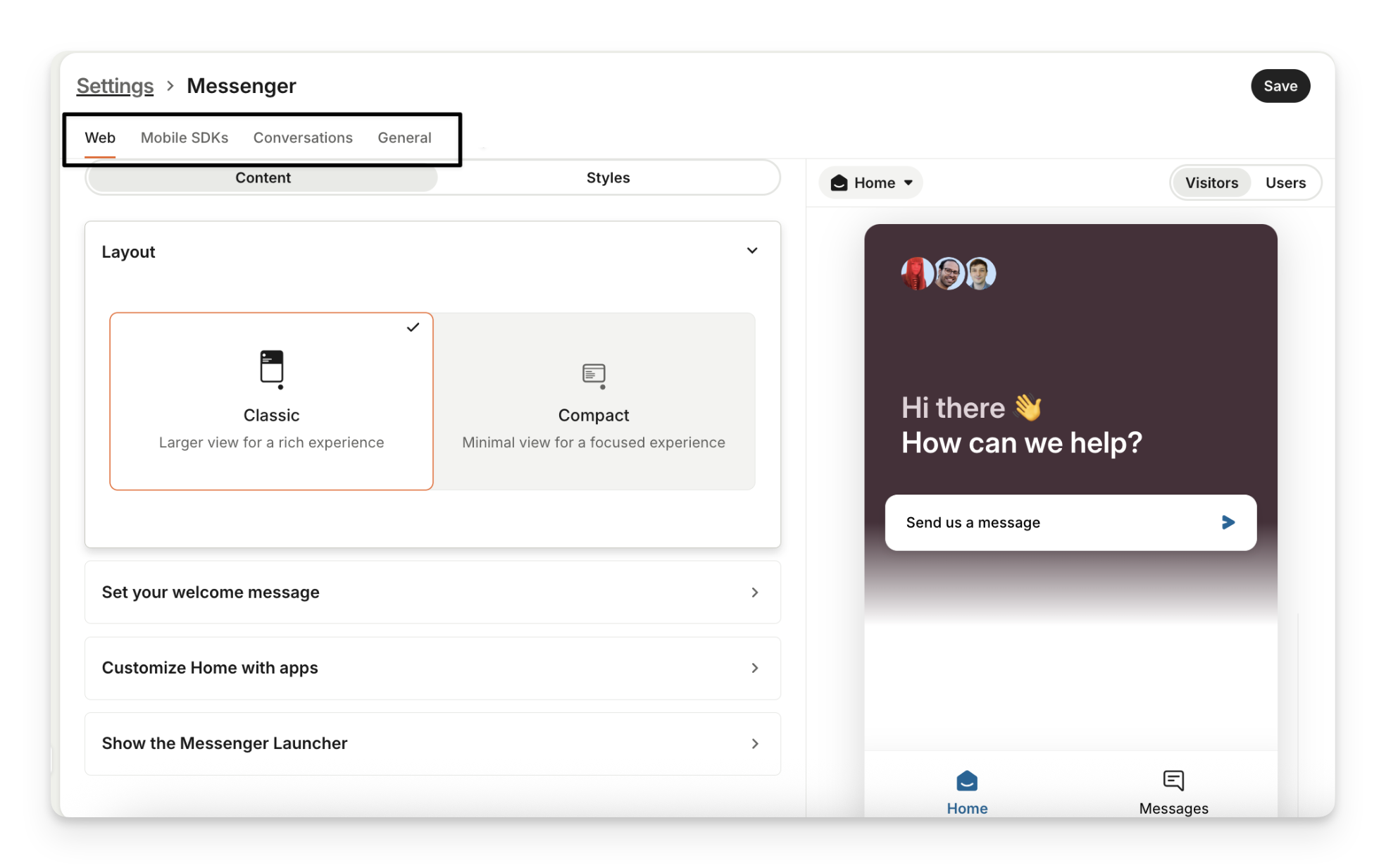 You can customize, preview and manage your Sweo Messenger settings in the Settings > Channels > Sweo Messenger section. Check out the following guide to learn how.