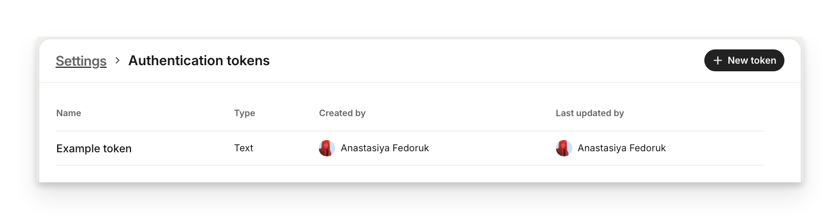 In the Settings > Authentication section you can create new authentication tokens as well as view their names and types.
