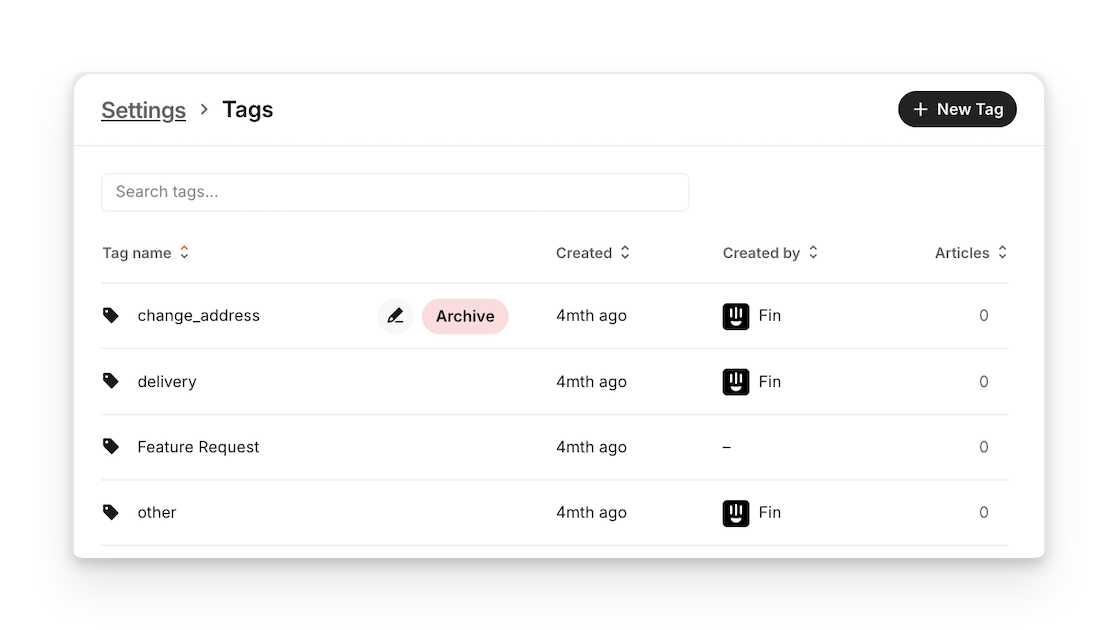 In the Settings > Tags section you can view a list of your workspace tags, create new tags, edit and archive existing tags.