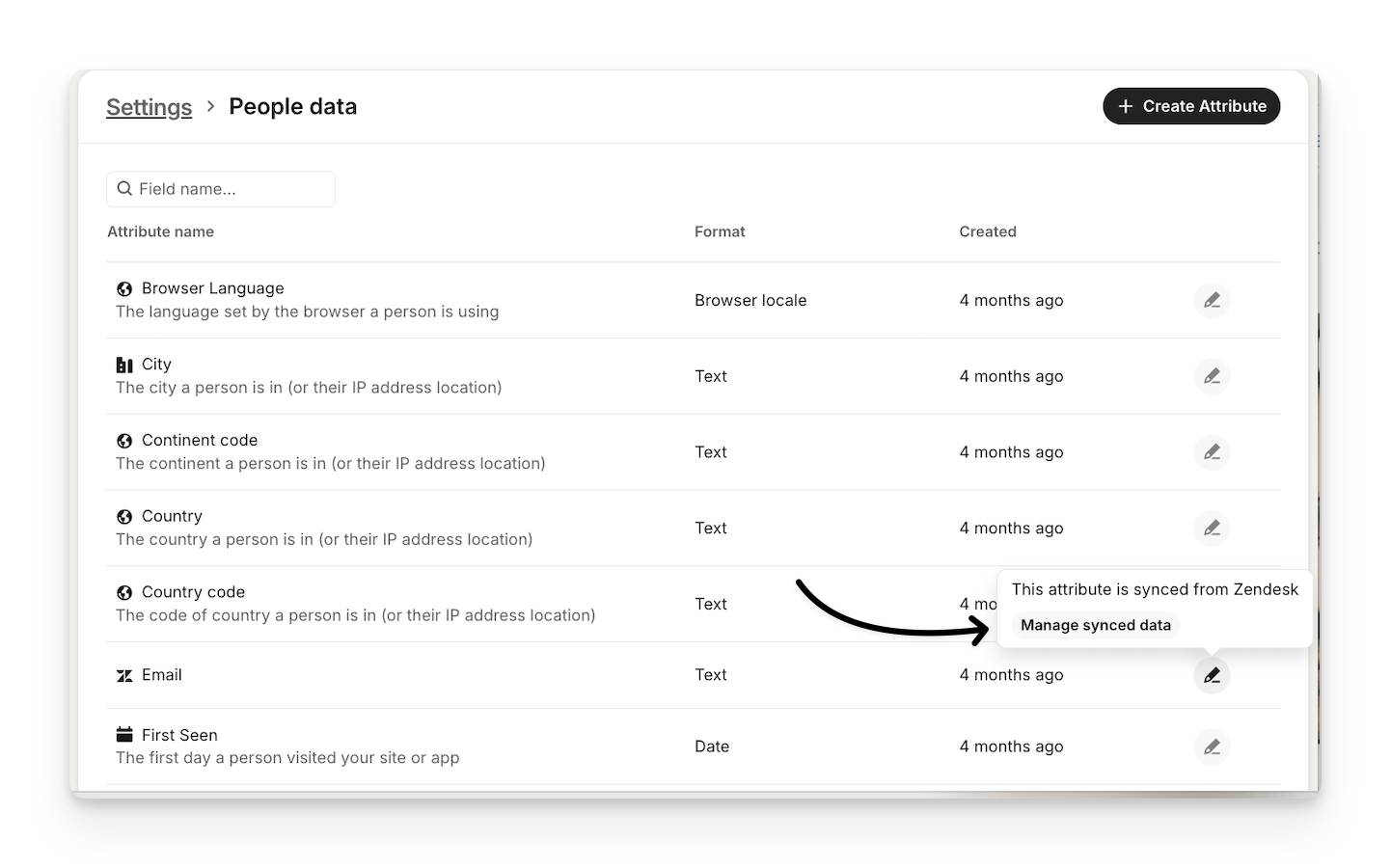 Settings > People data section allows you to manage your people attributes. Here you can view your list of people attributes (system, synced and custom attributes), create new attributes, change their format and archive them.