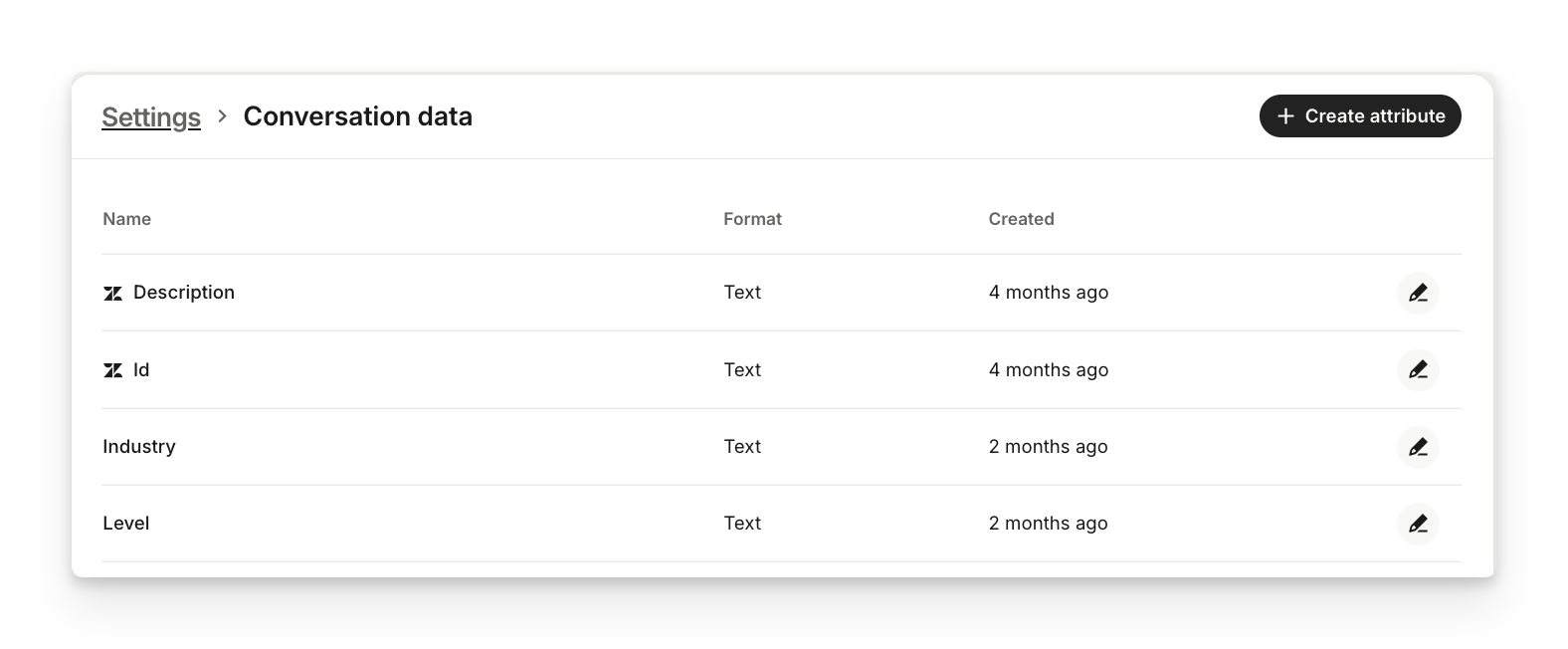 Manage all your conversation attributes in Settings > Conversation attributes. Here, you can view the list of your conversation attributes, create and edit them.