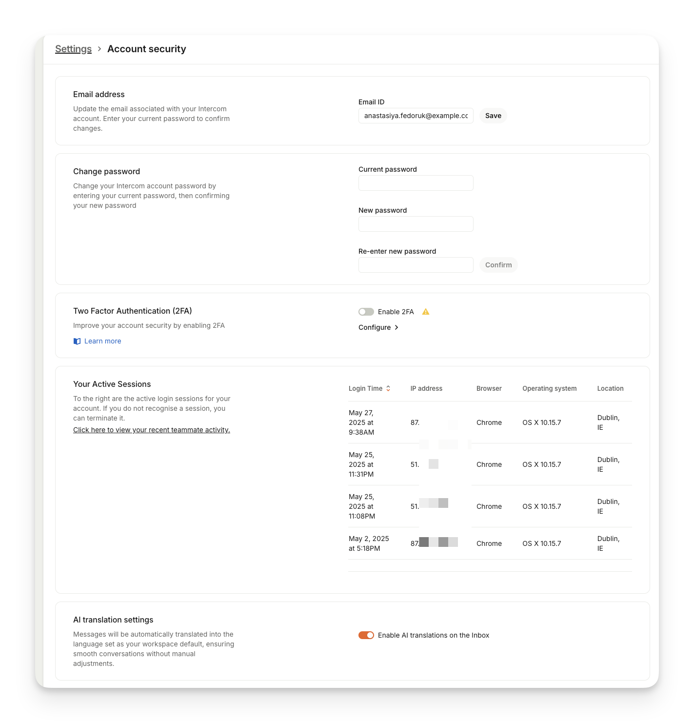 Configure security settings for your account in Settings > Personal > Account security. In this menu, you can update the email address associated with your Intercom account, change your password, enable 2FA, view your active login sessions and enable AI translation settings that will automatically translate messages into the language set as your workspace default, ensuring smooth conversations without manual adjustments.