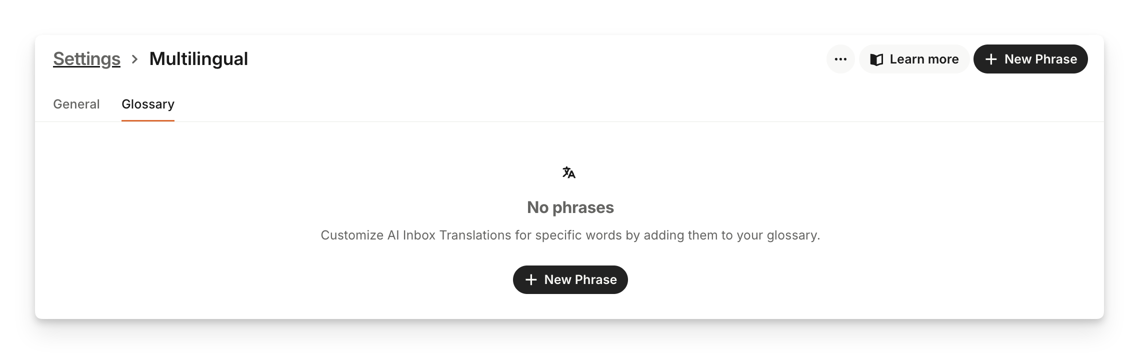 On the Glossary tab, you can customize AI Inbox Translations for specific words by adding them to your glossary.