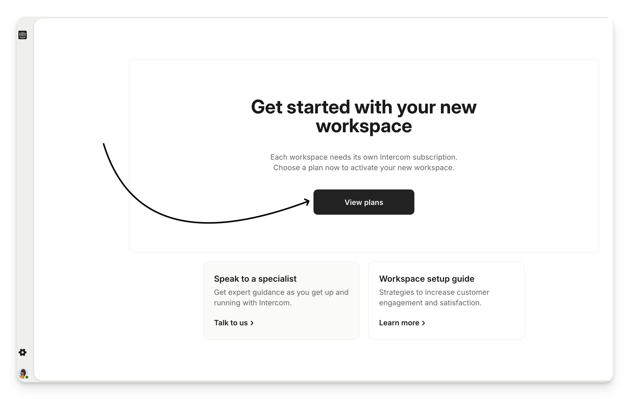 Once your subscription has ended, you'll no longer be able to see any of your data until you restart your subscription. You will only be able to access your Intercom settings and the option to start a new subscription:
