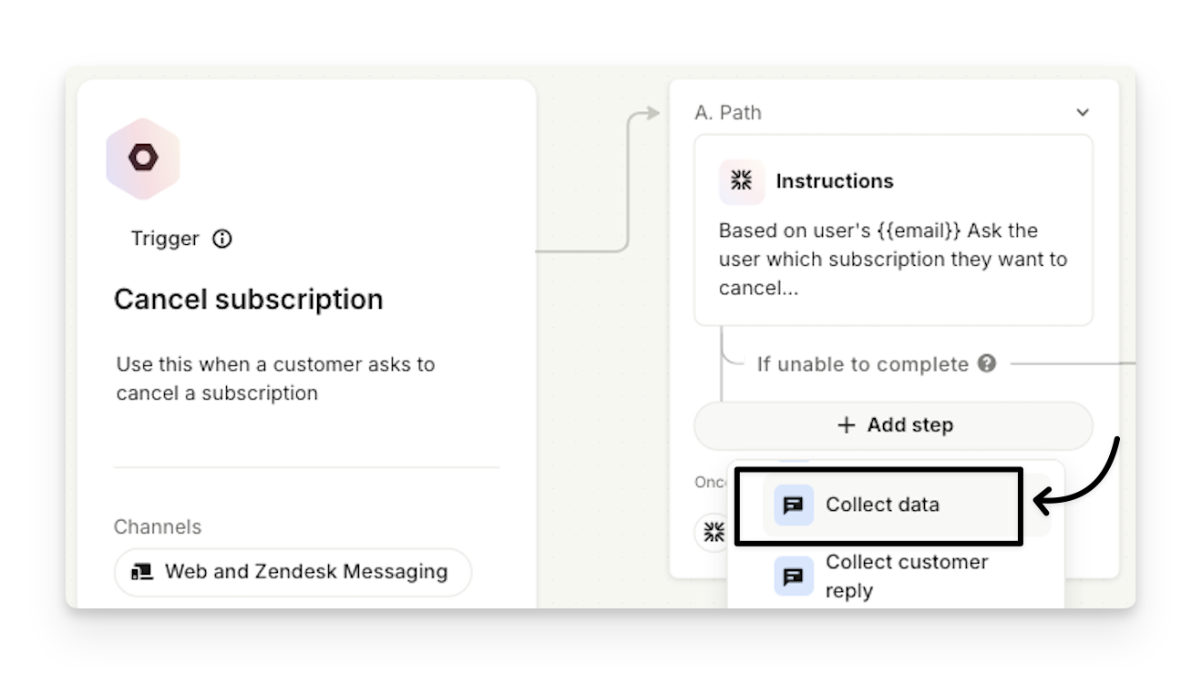 If you wish to collect data and store it for the user, company, conversation or just temporarily in your Workflow or Sweo Task, you can do so by using the “Collect data” step. This is useful if you want to later use the collected data to create conditional logic in the workflow / Sweo Task using branching.