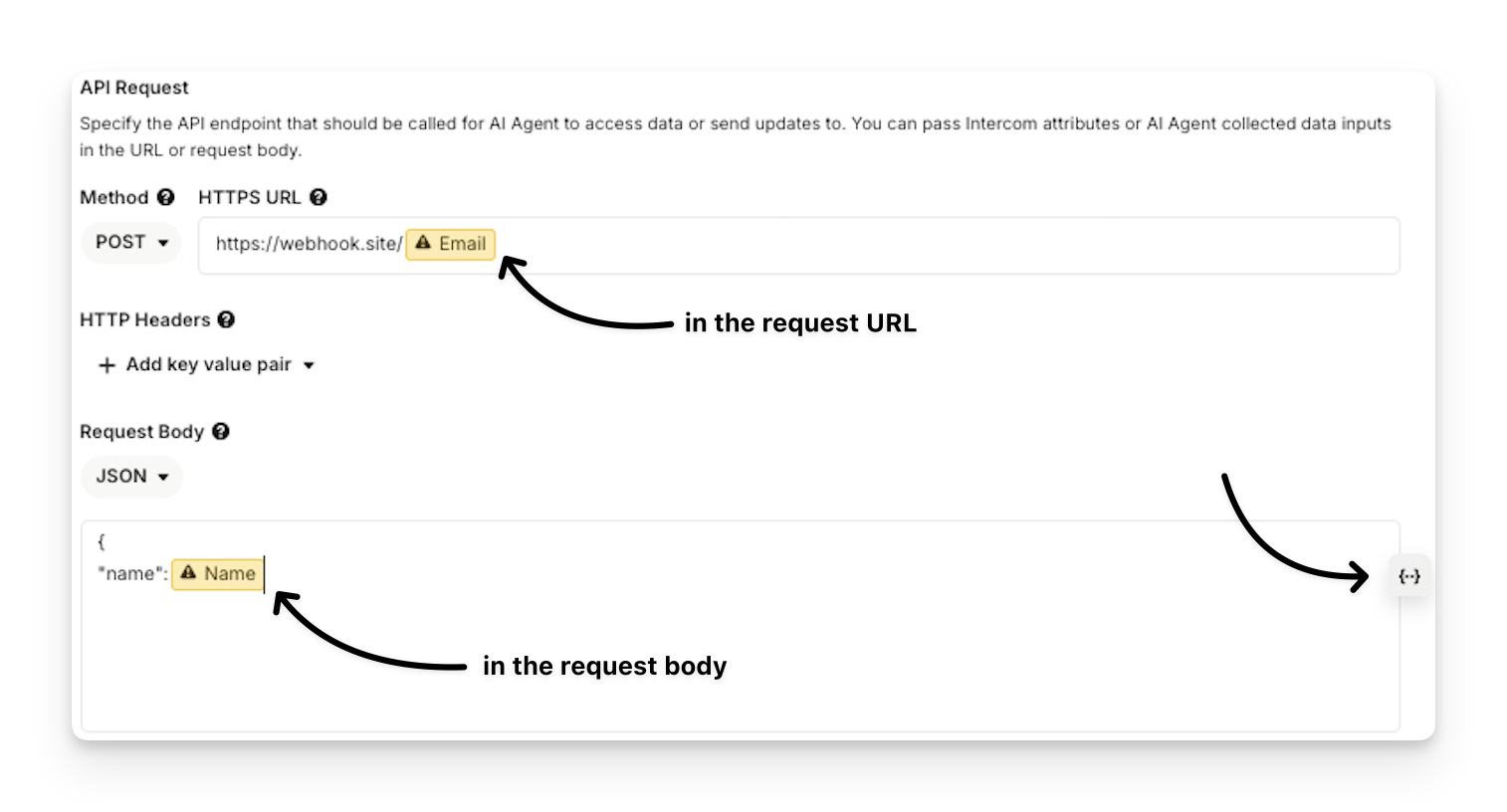 Data attributes can be used in both the request URL and the Request Body of the Action inserting them using the attribute inserter {..}