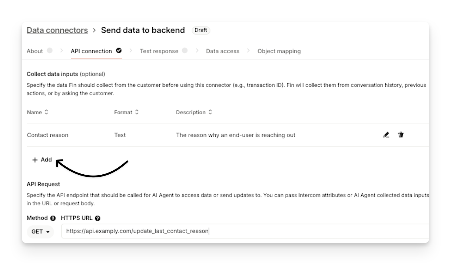 In your Data Connector, you'll need to create the same attribute(s) (contact reason in this example) that exist in your Workflow configuration: