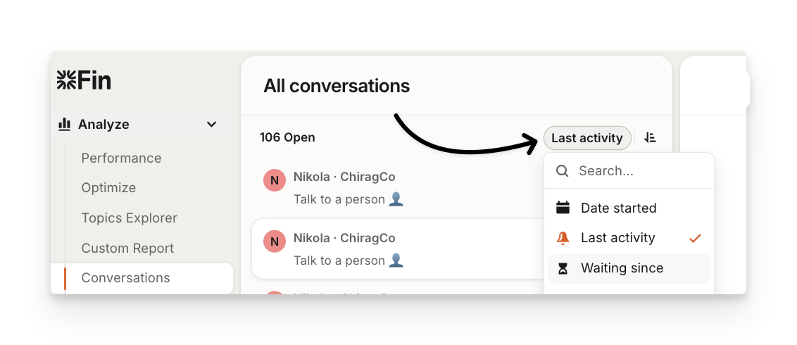 Waiting since – Sorts items by how long a user has waited for a teammates reply. Wait time begins at the start of a conversation or from the user's first message after the last teammate reply. Follow-up user replies, teammate notes, and bot replies don’t affect it. The timestamp on the conversation card reflects this first message. Once a teammate replies, the user is no longer waiting, and these conversations, along with back-office and tracker tickets, move to the bottom and don't display a timestamp.