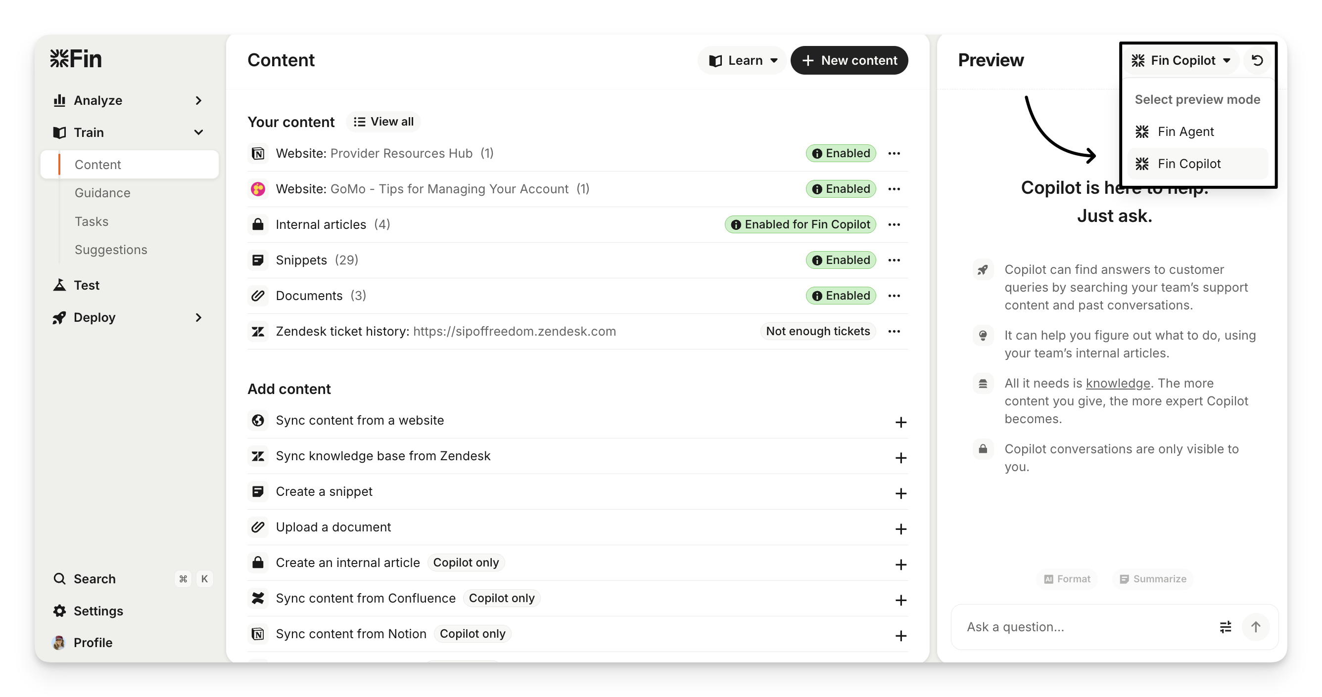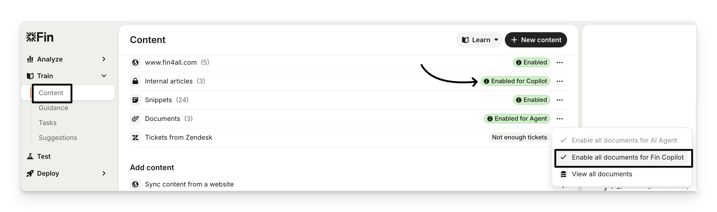 The Train > Content section is where you store and manage all sources to power Sweo and Copilot. From here, you can start importing or creating new content and decide which content you want to enable for Copilot.