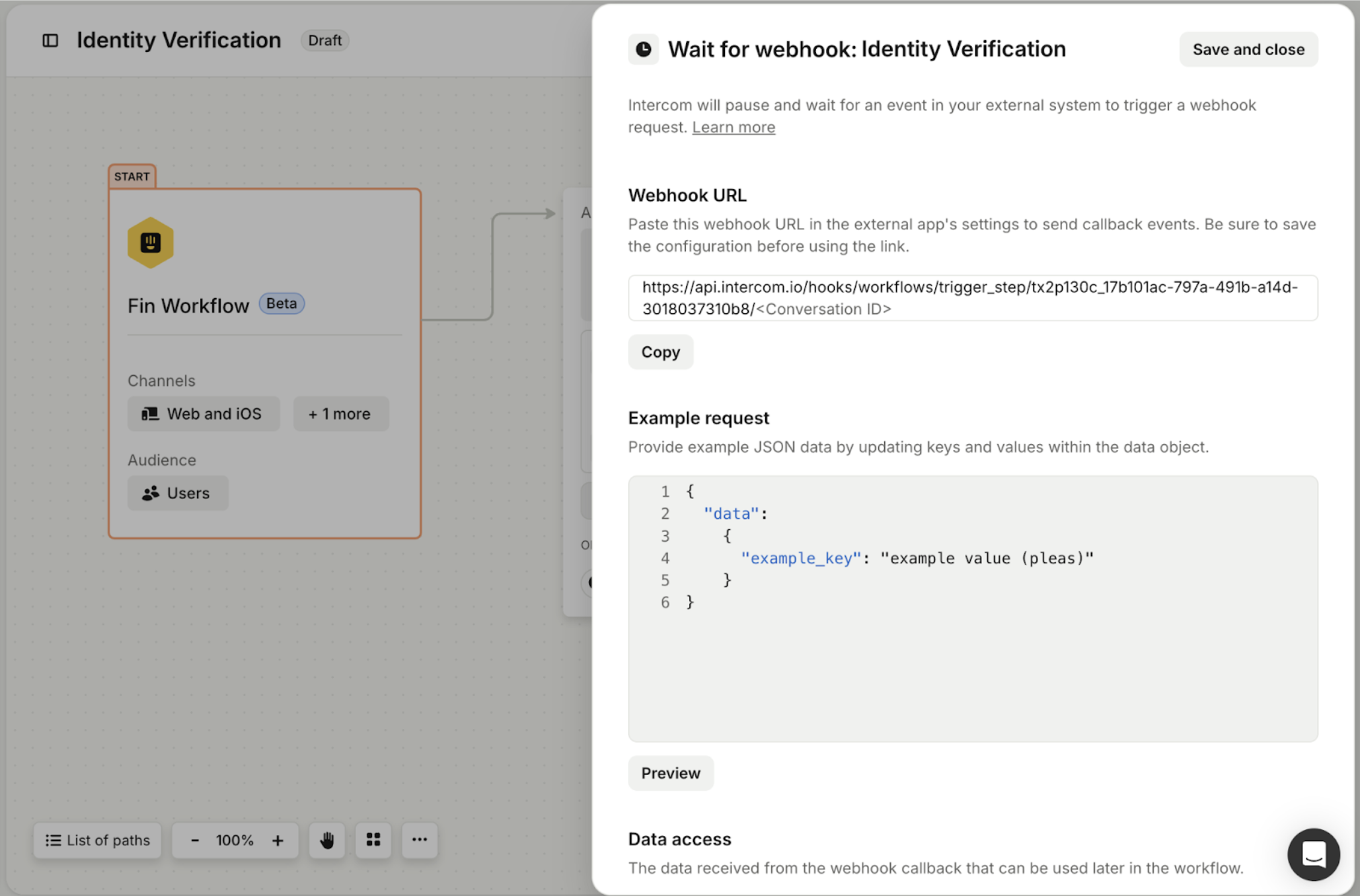 Imagine your workflow needs to integrate with an external system—such as a third-party application for identity verification. With Wait for webhook, the workflow stops at this step until the external system sends a webhook response. Once received, the task resumes and takes action based on the provided data. In the context of Zendesk integration, the workflow can pause customer interactions until a webhook response provides a status update or resolution. To ensure a smooth user experience, it's helpful to add an advisory message before this step, encouraging customers to start a new conversation if they have further questions during the pause.