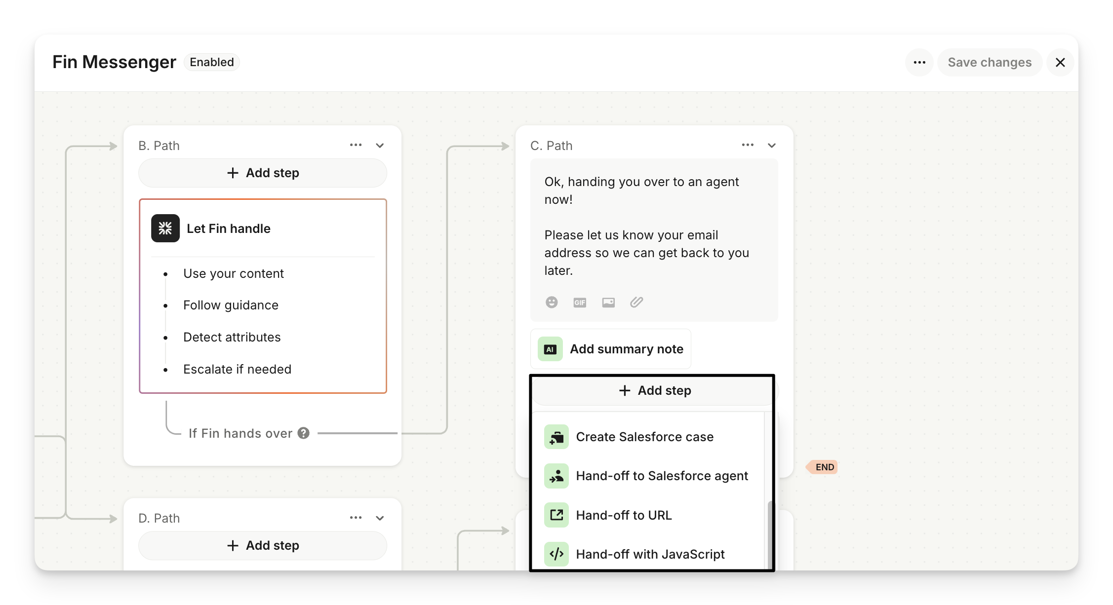 In the final hand-off path of the workflow, you can choose how Sweo hands over the conversation: