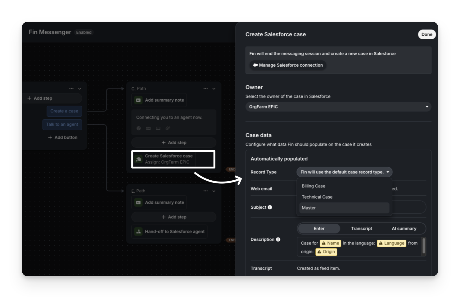 Create a Salesforce Case: Ends the users session in Intercom and creates a Case with a conversation summary and collected data.