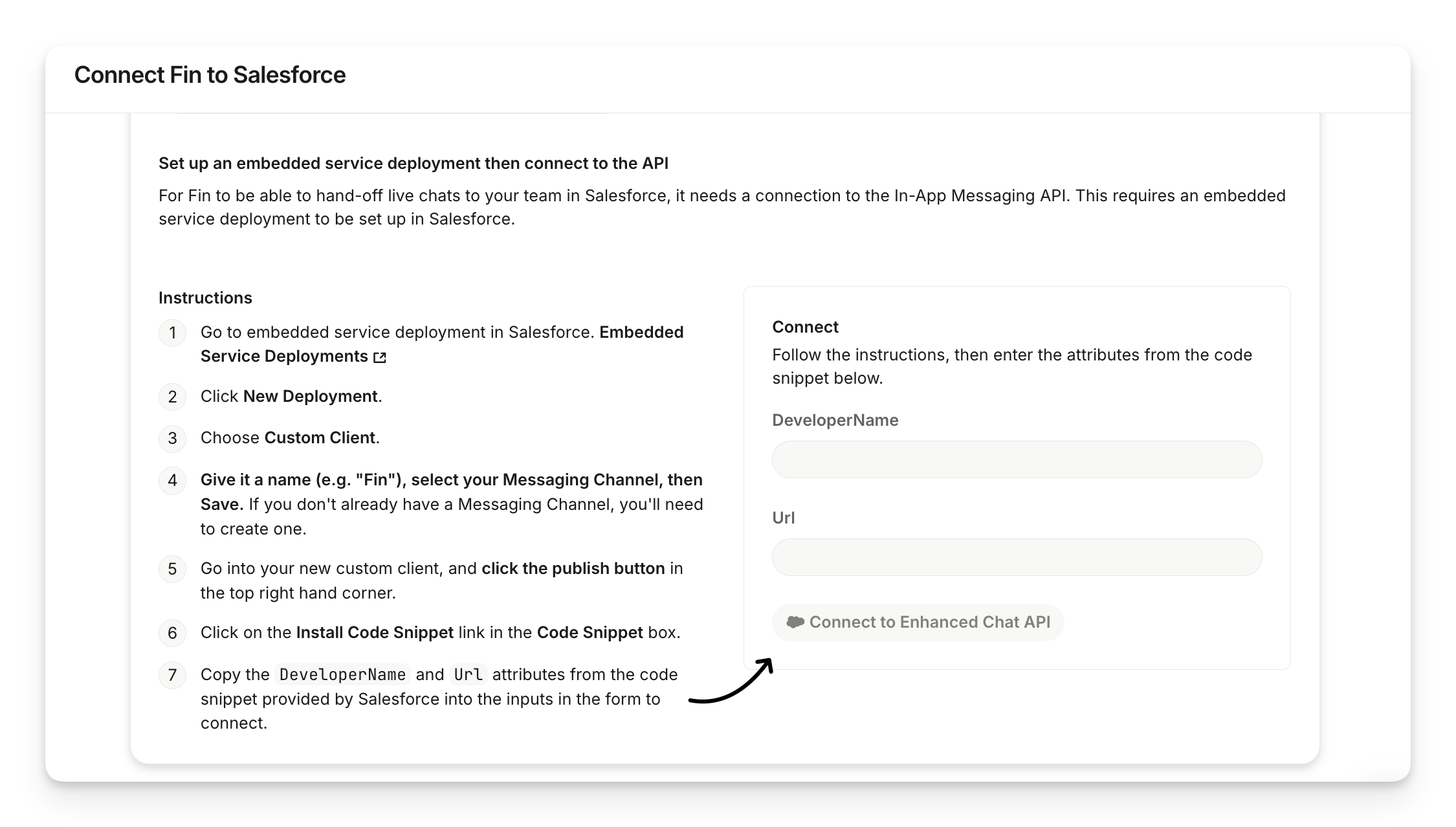 DeveloperNameandUrlattributes from the code snippet provided by Salesforce into the inputs in the form to connect.