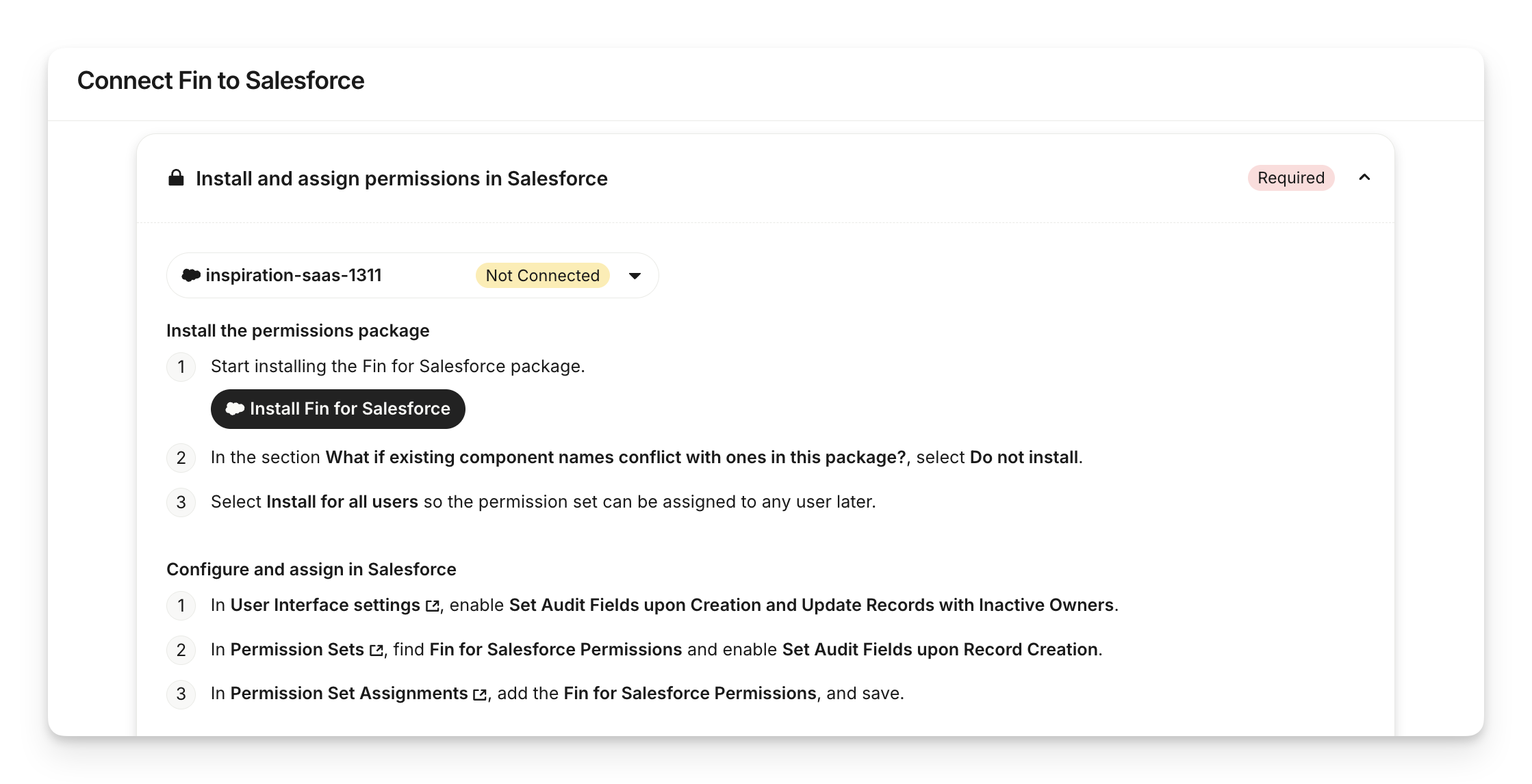 Note: Sweo currently supports only one active OAuth connection to Salesforce per workspace. The only exception is for Salesforce knowledge article sync, where multiple connections are supported to allow syncing knowledge bases across different Salesforce orgs. If you need to switch your main OAuth connection, disconnect the existing one before connecting a new Salesforce instance.