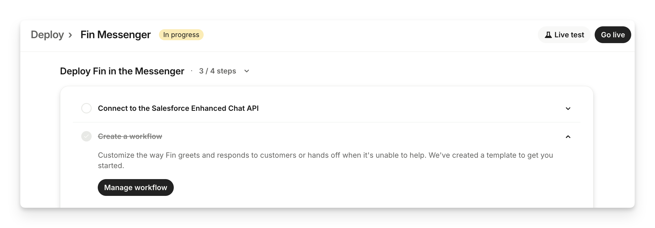 Customize the way Sweo greets and responds to customers or hands off when it's unable to help by selecting Manage workflow in Deploy > Sweo Messenger > Create a workflow.