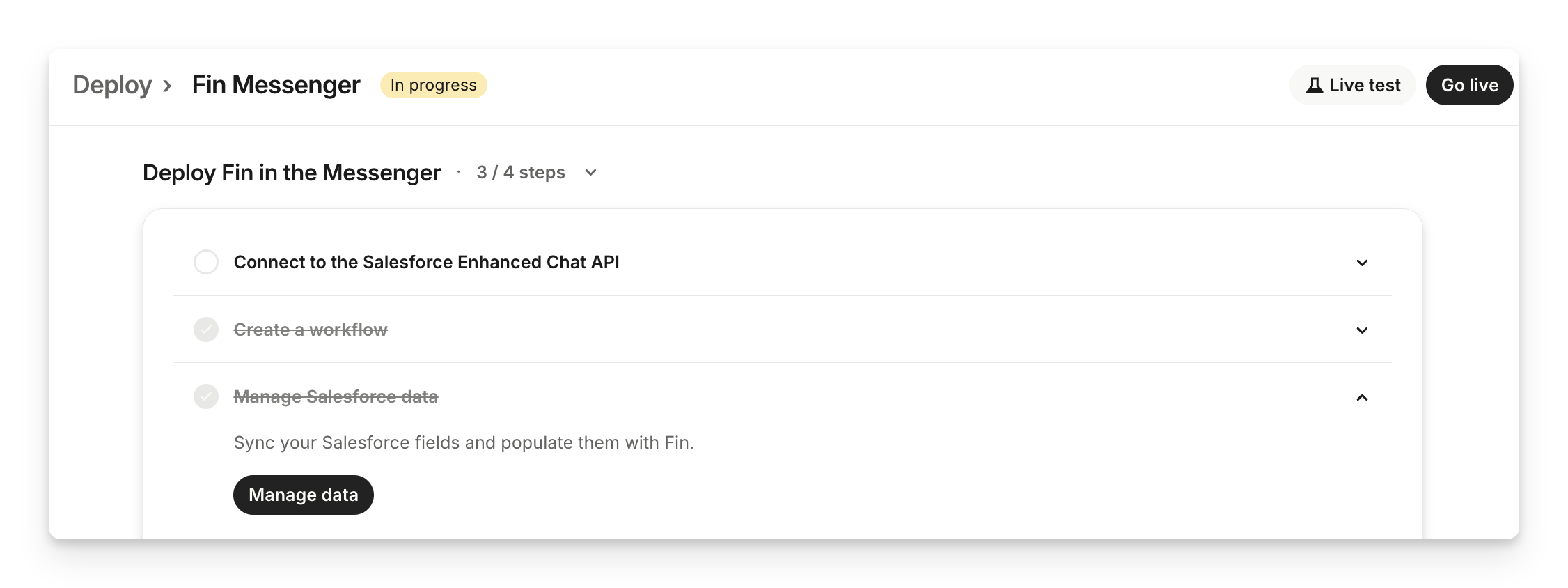 Next, open Deploy > Sweo Messenger > Manage Salesforce data and click Manage data to sync your Salesforce fields and populate them with Sweo.