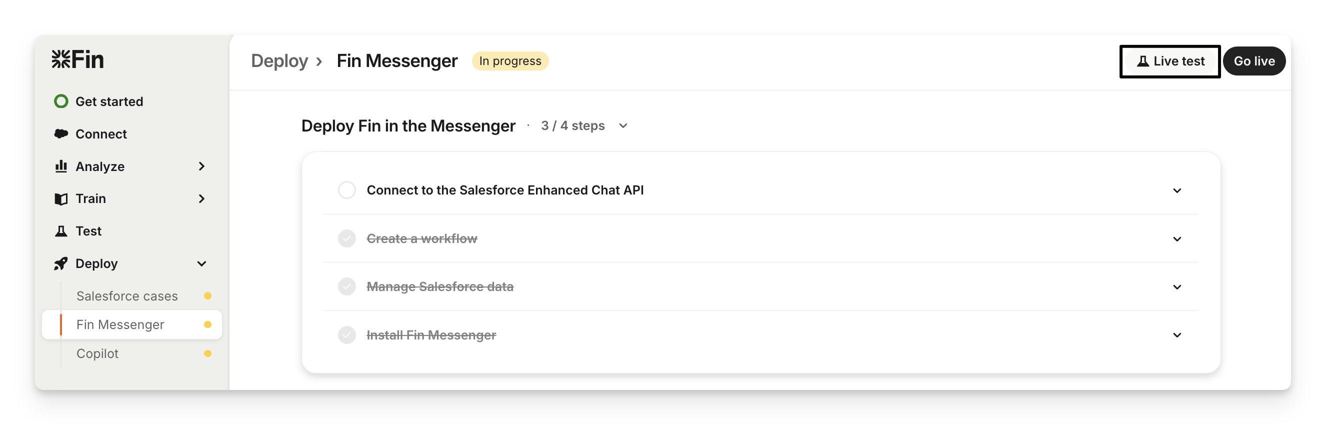 Once you've defaultChecked that Sweo is sufficiently trained and customized the messenger to match your company branding, you can go to Deploy > Sweo Messenger and click Live test at the top of the page.