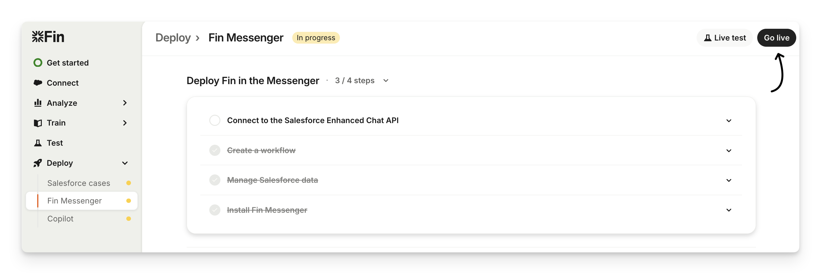 Now you’re ready to set Sweo live for your customers. Go to Deploy > Sweo Messenger and select Go Live at the top of the page.
