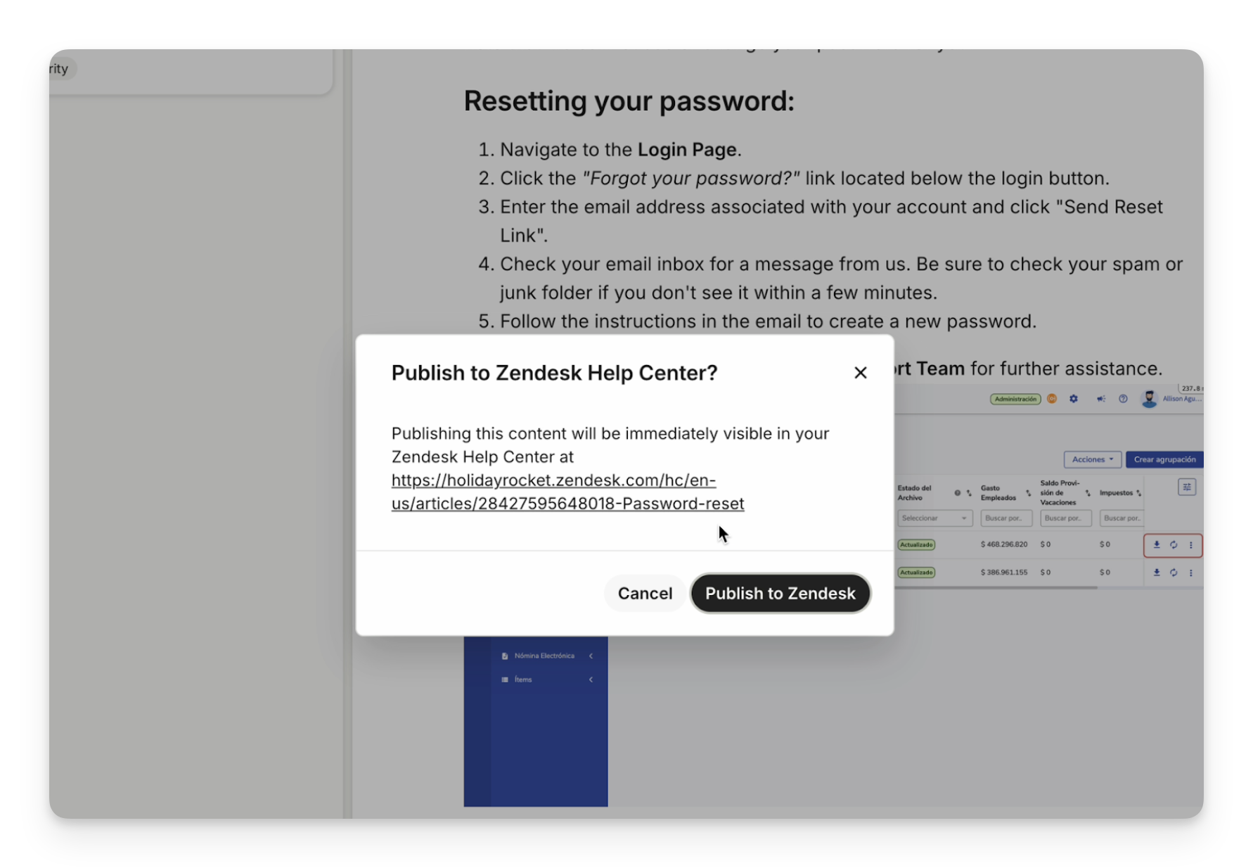 Once you click Publish to Zendesk, the article goes live in your Zendesk help center and can be edited as normal in Zendesk.