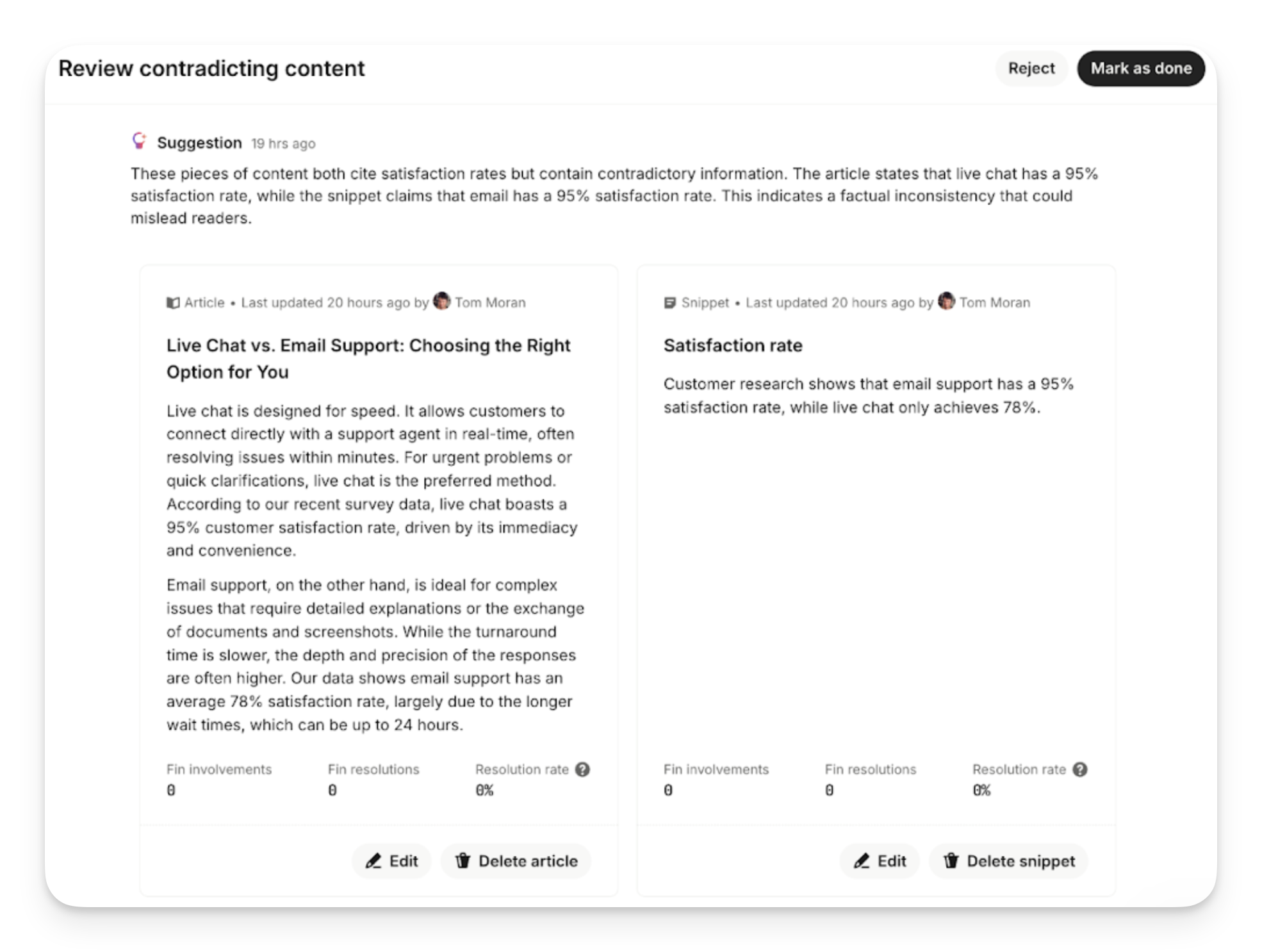 Contradicting content suggestions help you pinpoint content with information that is at odds with one another. This lets you quickly review and resolve the discrepancies, ensuring your knowledge base is a single source of truth. By fixing these contradictions, you'll help Sweo provide clear, accurate, and reliable answers to your customers.