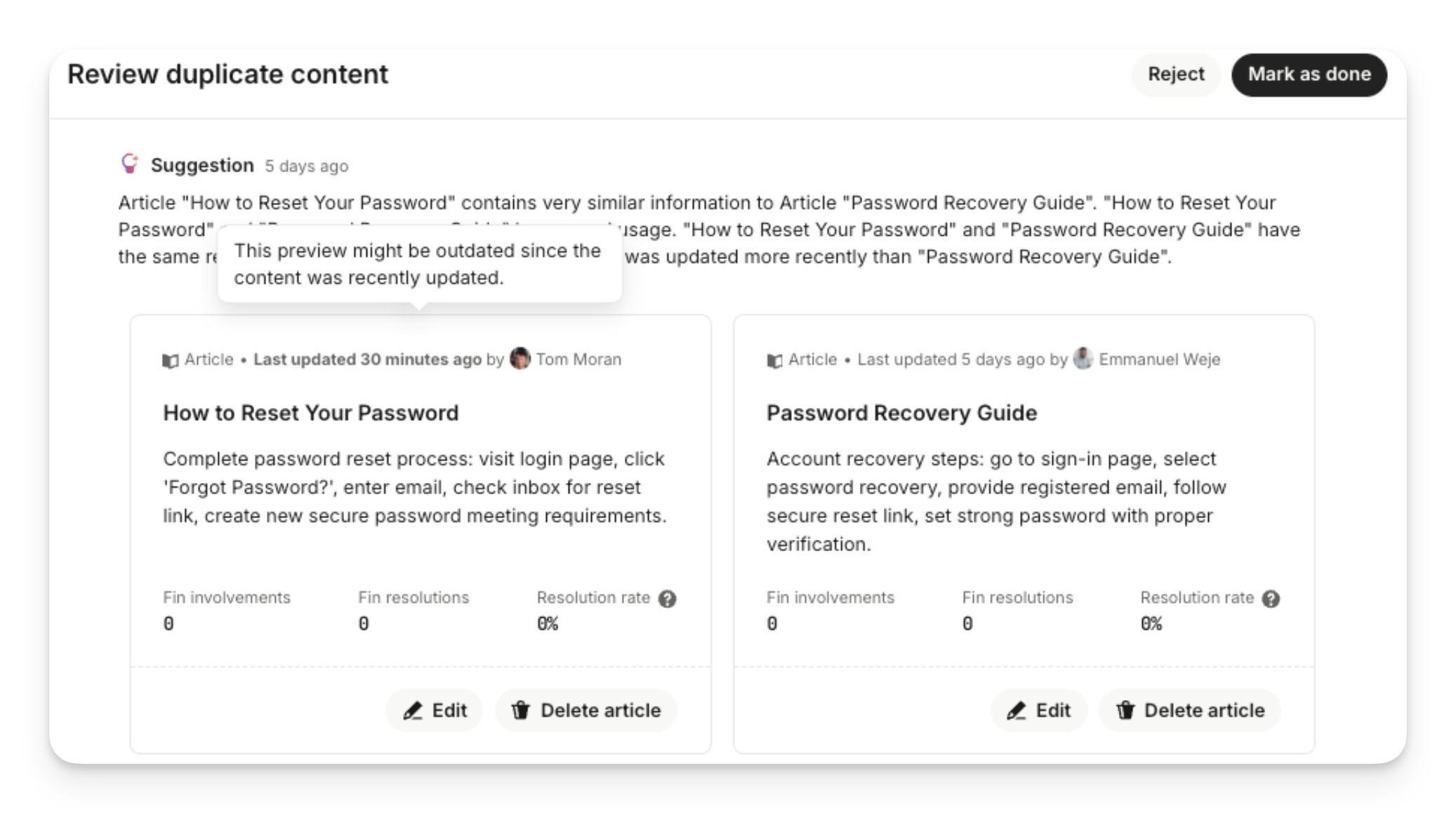 For example, a suggestion might show you two articles that both contain very similar instructions on how to reset a password.