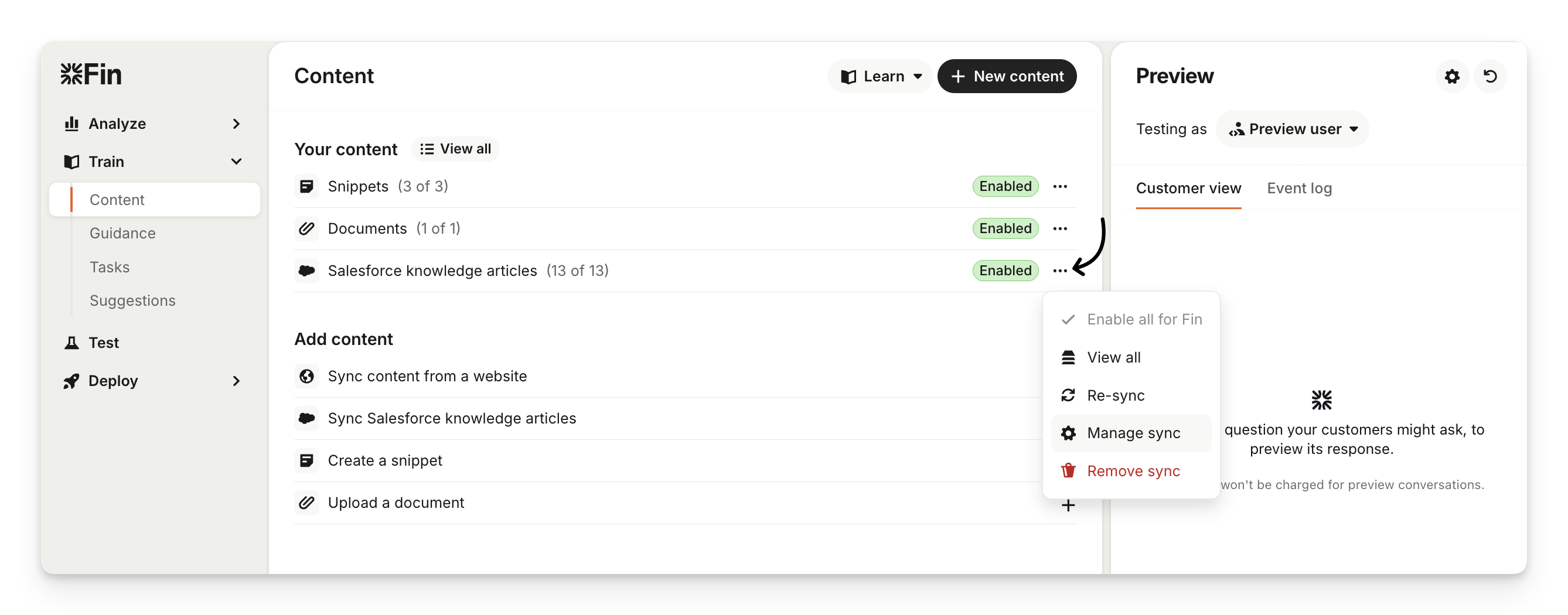 In order to use this feature, you'll need to map the content field to a Salesforce field so that we know what field to publish the article to in Salesforce. Go to Train > Content and click on the 3 dot menu to manage your Salesforce knowledge articles. Select Manage sync then click Continue to map fields from Salesforce articles.