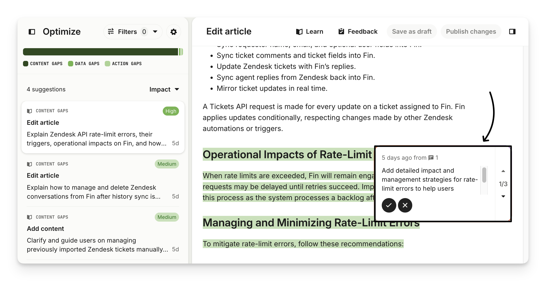 If you use Sweo for Zendesk, you can receive content gap suggestions to edit Zendesk-synced articles and publish the article to your help center from within your Sweo workspace.