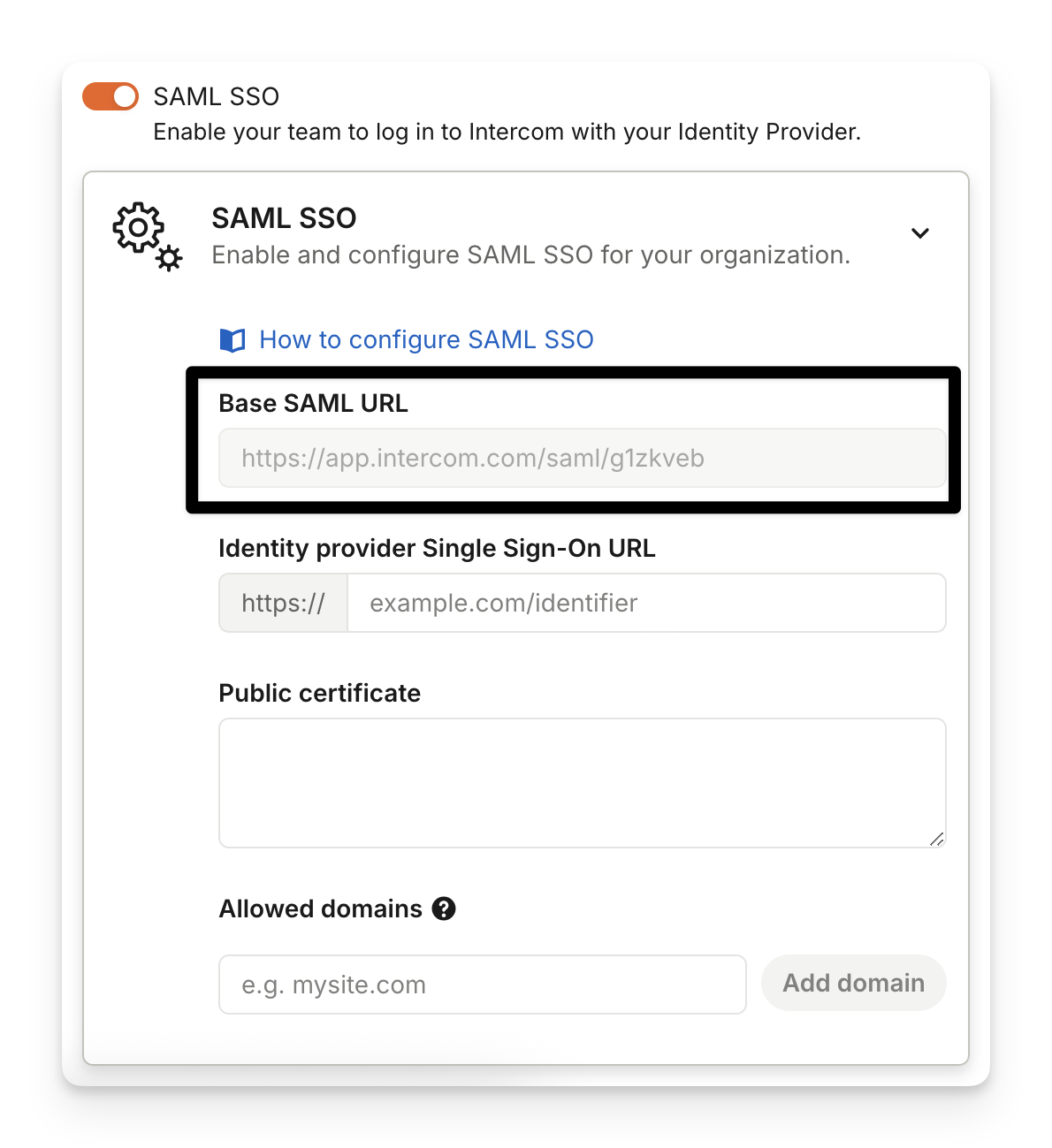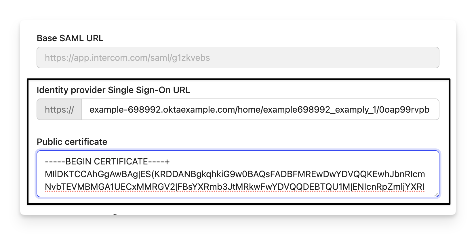 >You’ll need to include this to configure SAML SSO with your identity provider. If you set up SAML with Intercom Okta App or OneLogin, you need only <SAML URL>.