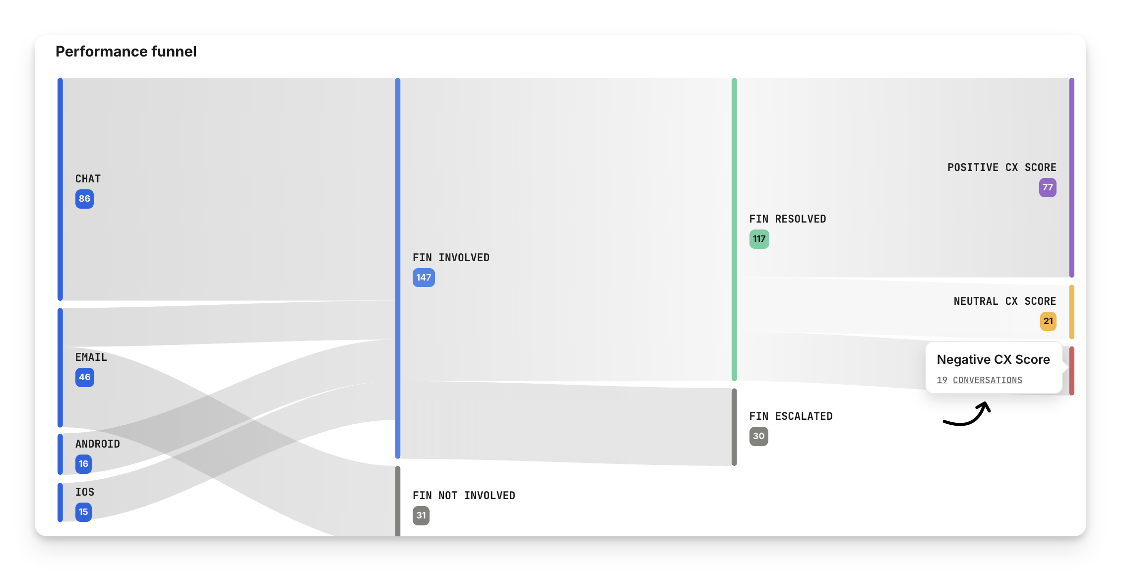 The Performance funnel visualizes how conversations flow through key stages when Sweo is involved. It allows you to quickly understand Sweo's coverage across channels, success at resolving queries, and the customer experience—all in a single, digestible view.