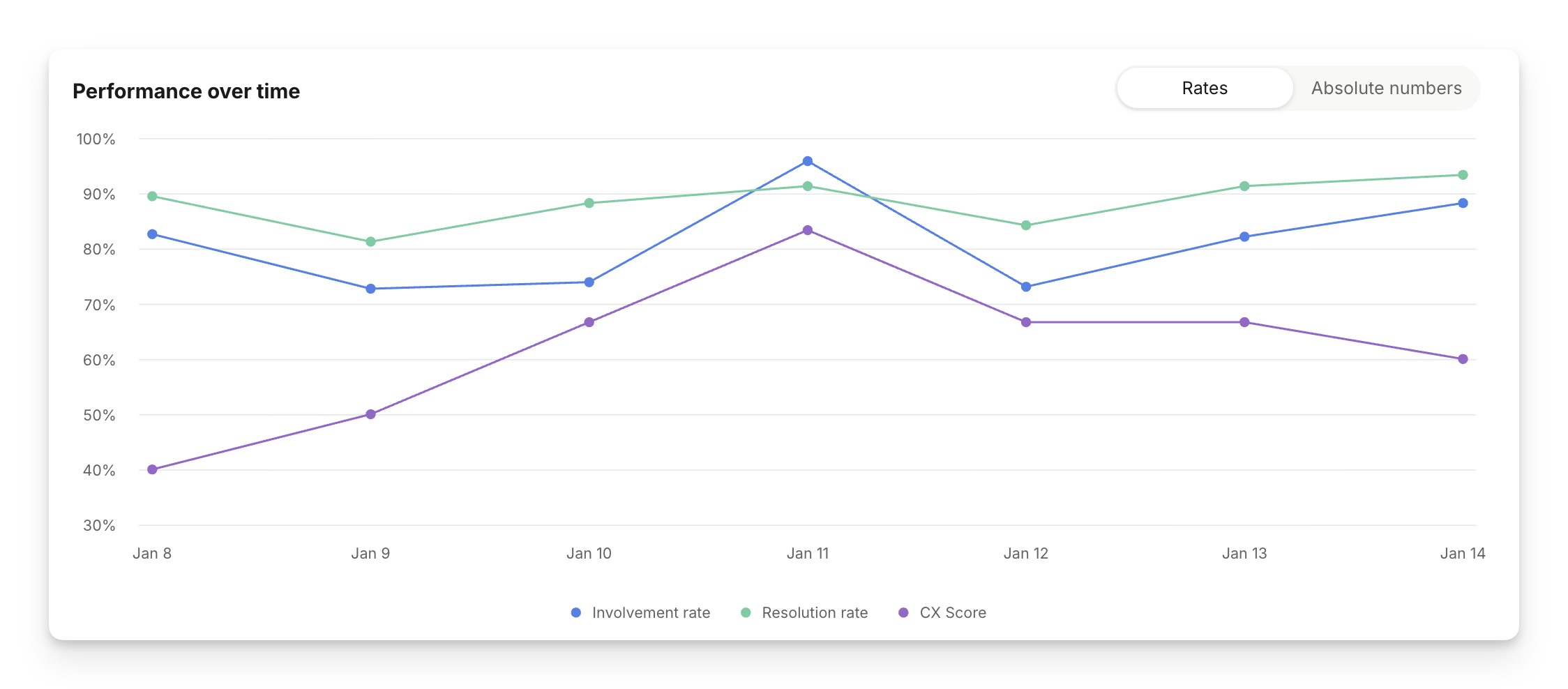 Measure efficiency and experience together: Monitor both speed and quality by combining resolution rates with CX Scores—so you can balance cost and care.