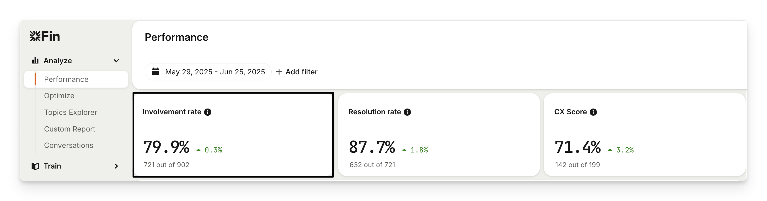 If this rate is steadily increasing, you're on the right track. However, if you notice a decline, go to Analyze > Optimize to identify gaps and opportunities to improve Sweo's resolution rate.