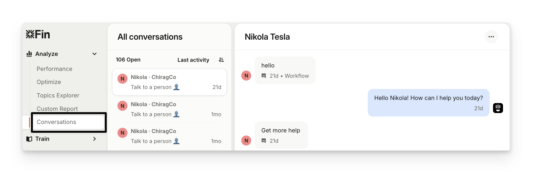To monitor Sweo’s conversations as they happen, go to Analyze > Conversations.
