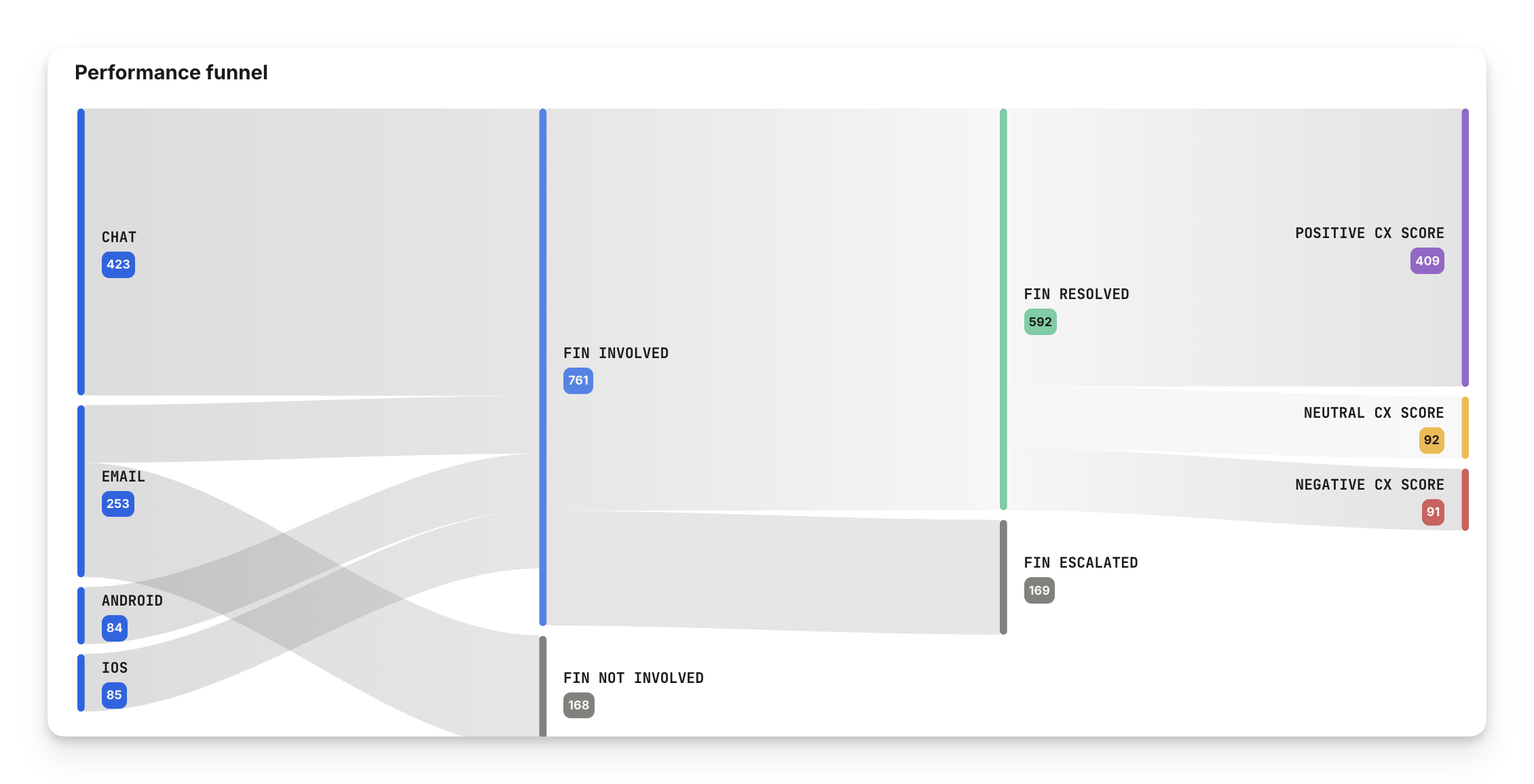 The Performance funnel visualizes how conversations flow through key stages when Sweo is involved. It allows you to quickly understand Sweo's coverage, success at resolving queries, and the customer experience—all in a single, digestible view.