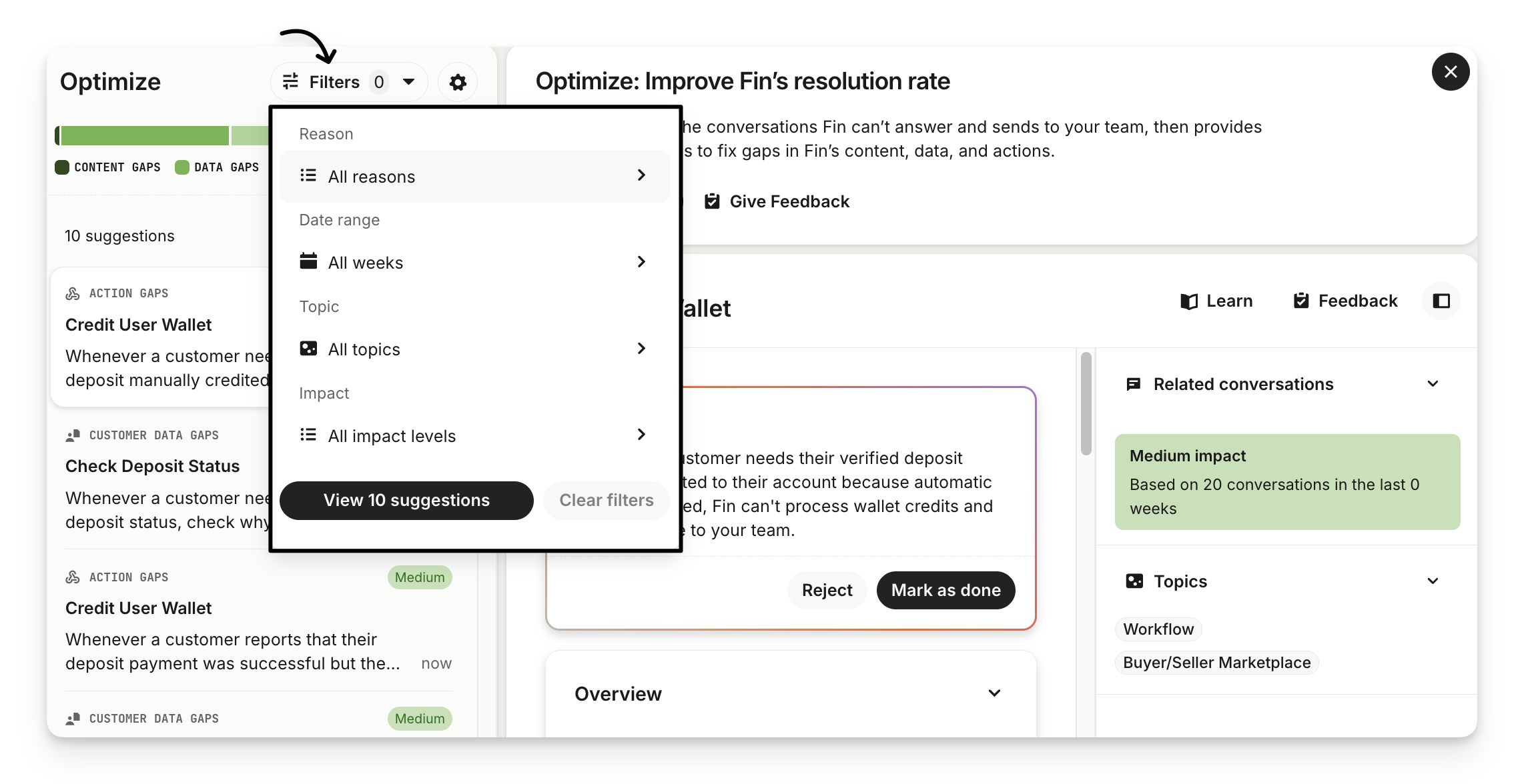 You'll be able to filter by reason, date, topic, and impact, and see the conversations which fall under them to understand where to improve Sweo.
