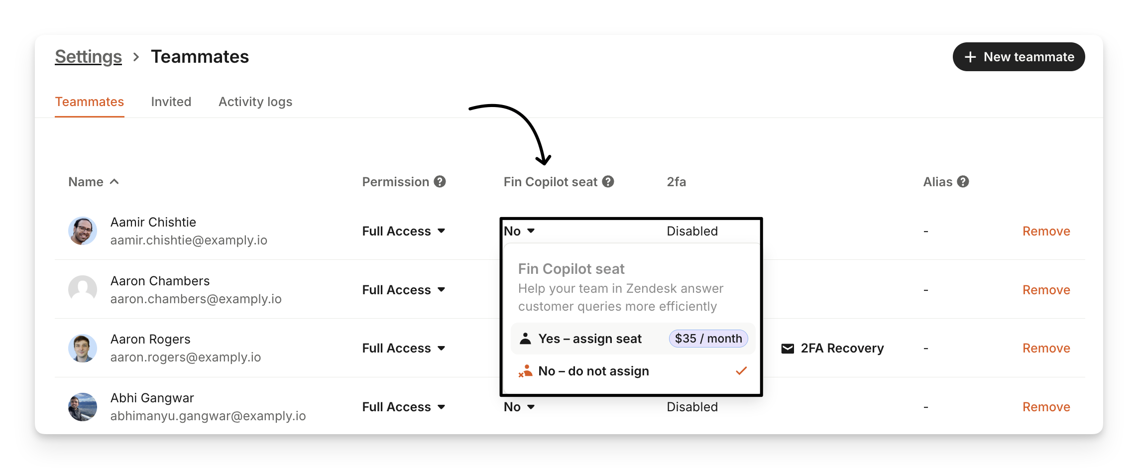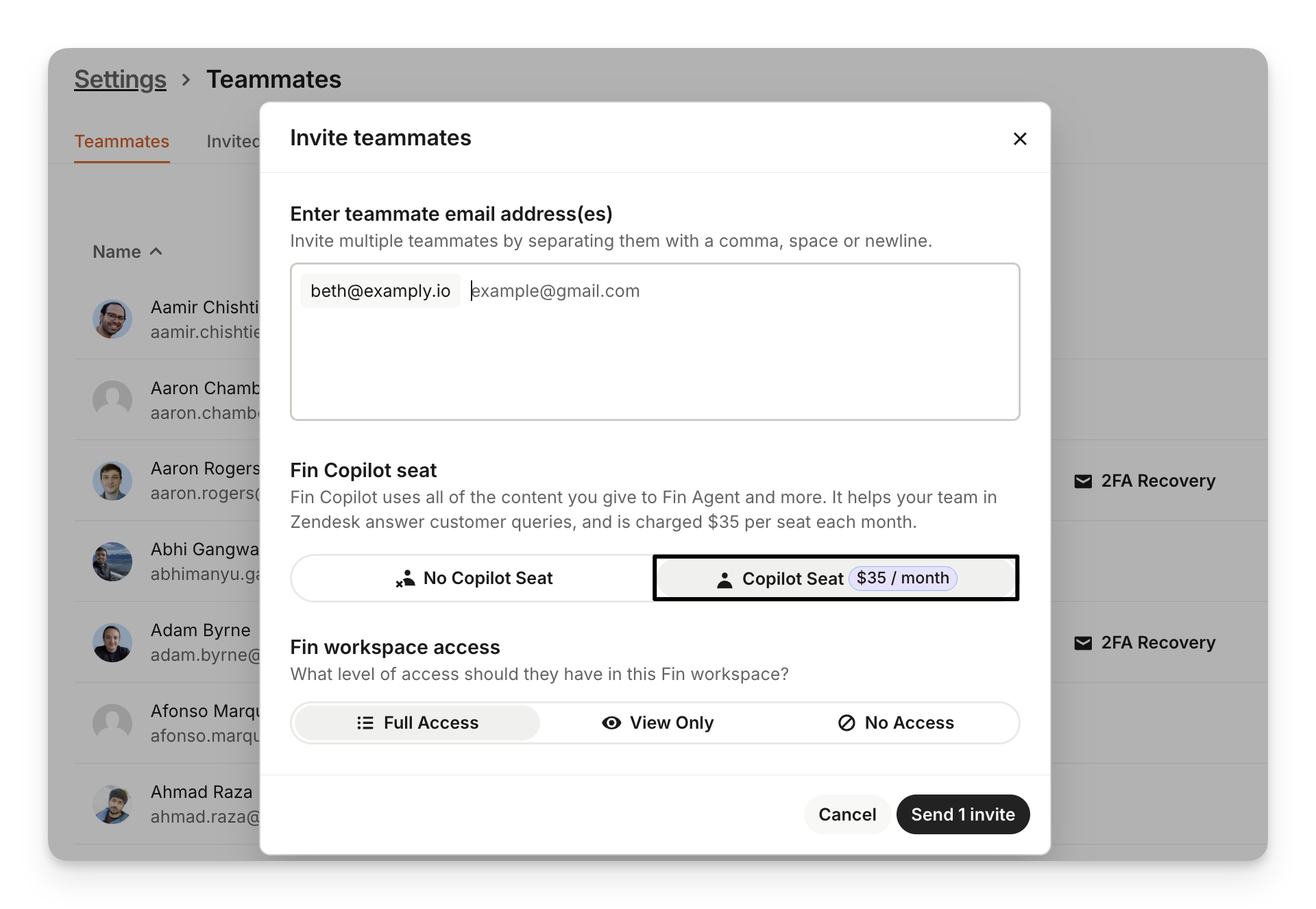Copilot costs $35/month per teammate, so you must select which Zendesk agents you’d like to have access. You can give access to Copilot only, or also invite agents to your Sweo workspace for those who need to manage Copilot’s training and performance.