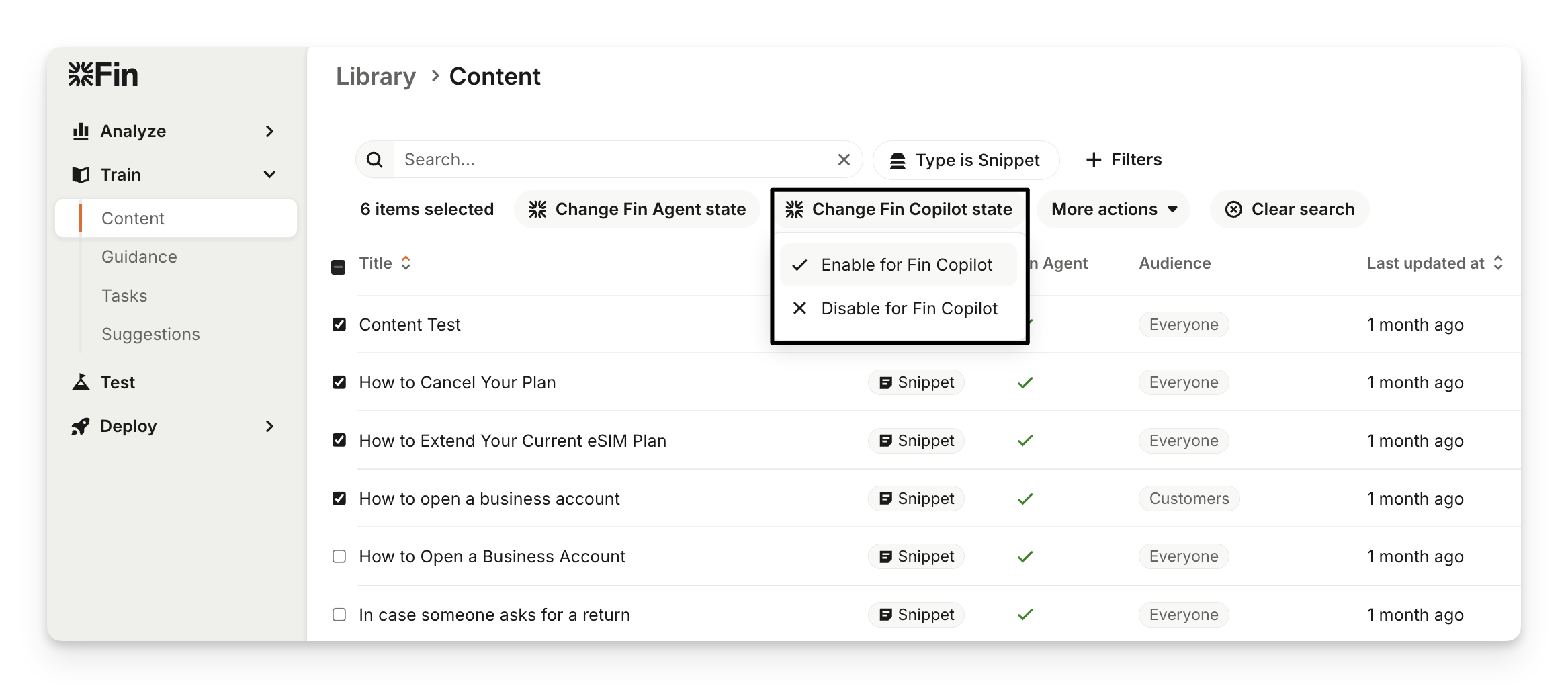 Go to the Train > Content section in Sweo and open the content source you want to enable for Copilot.