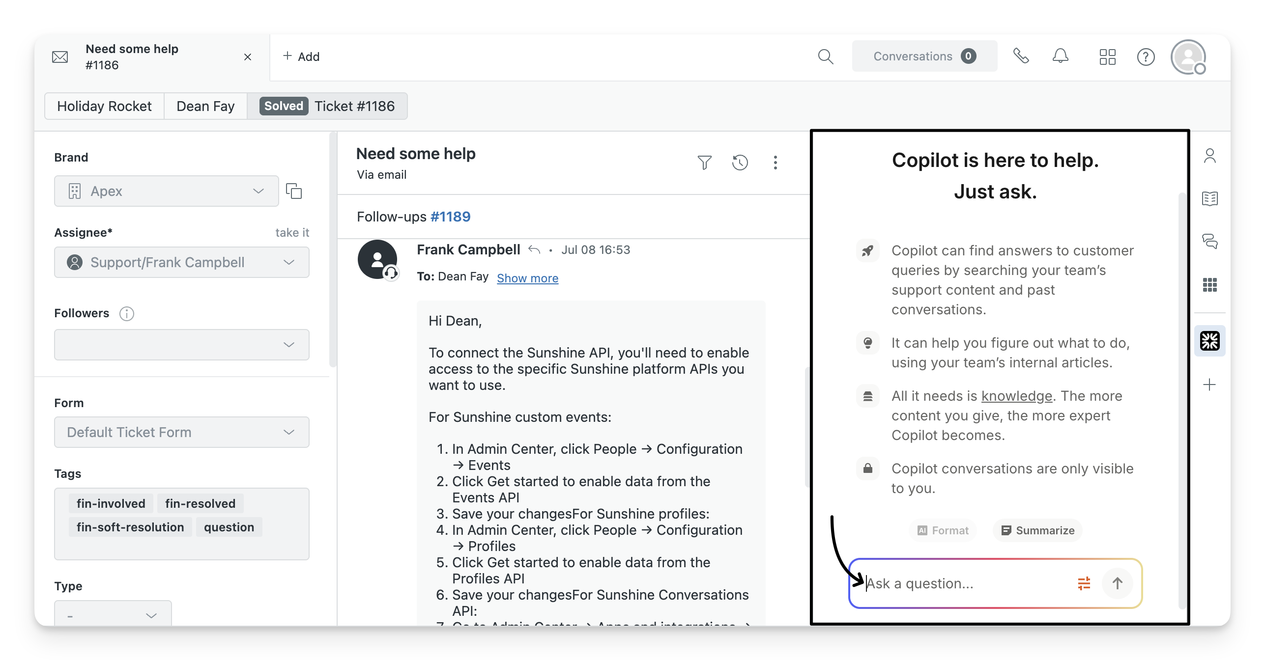 This means the Copilot integration does not count towards Zendesk’s Sunshine API or MAU limits.