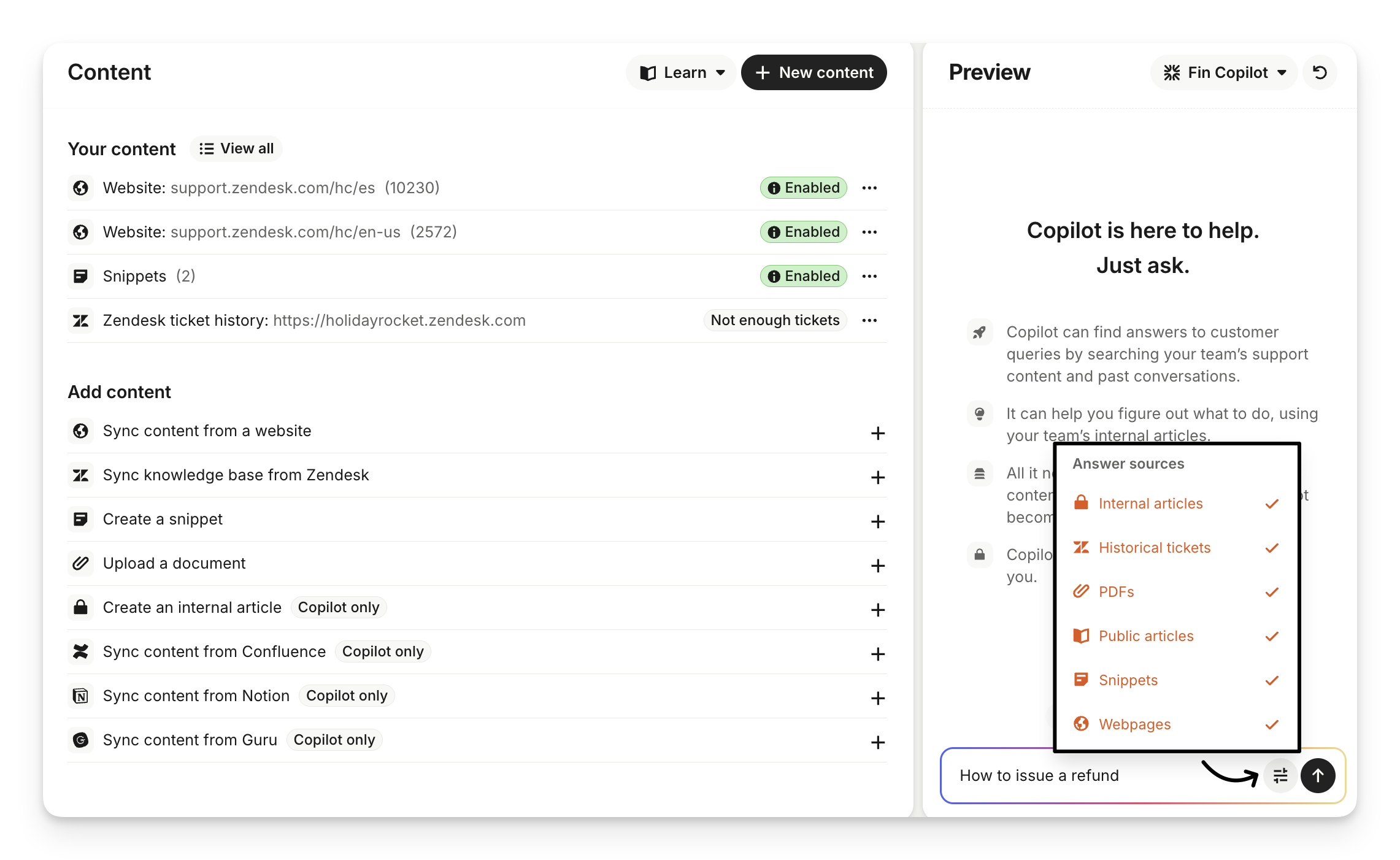 Copilot uses the sources you've enabled in your Sweo workspace to answer questions.