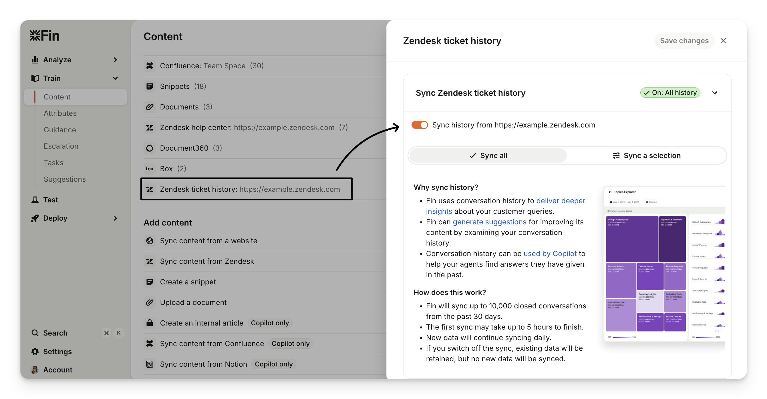 From the Train > Content section, you can also select Zendesk ticket history and enable the toggle to sync history.