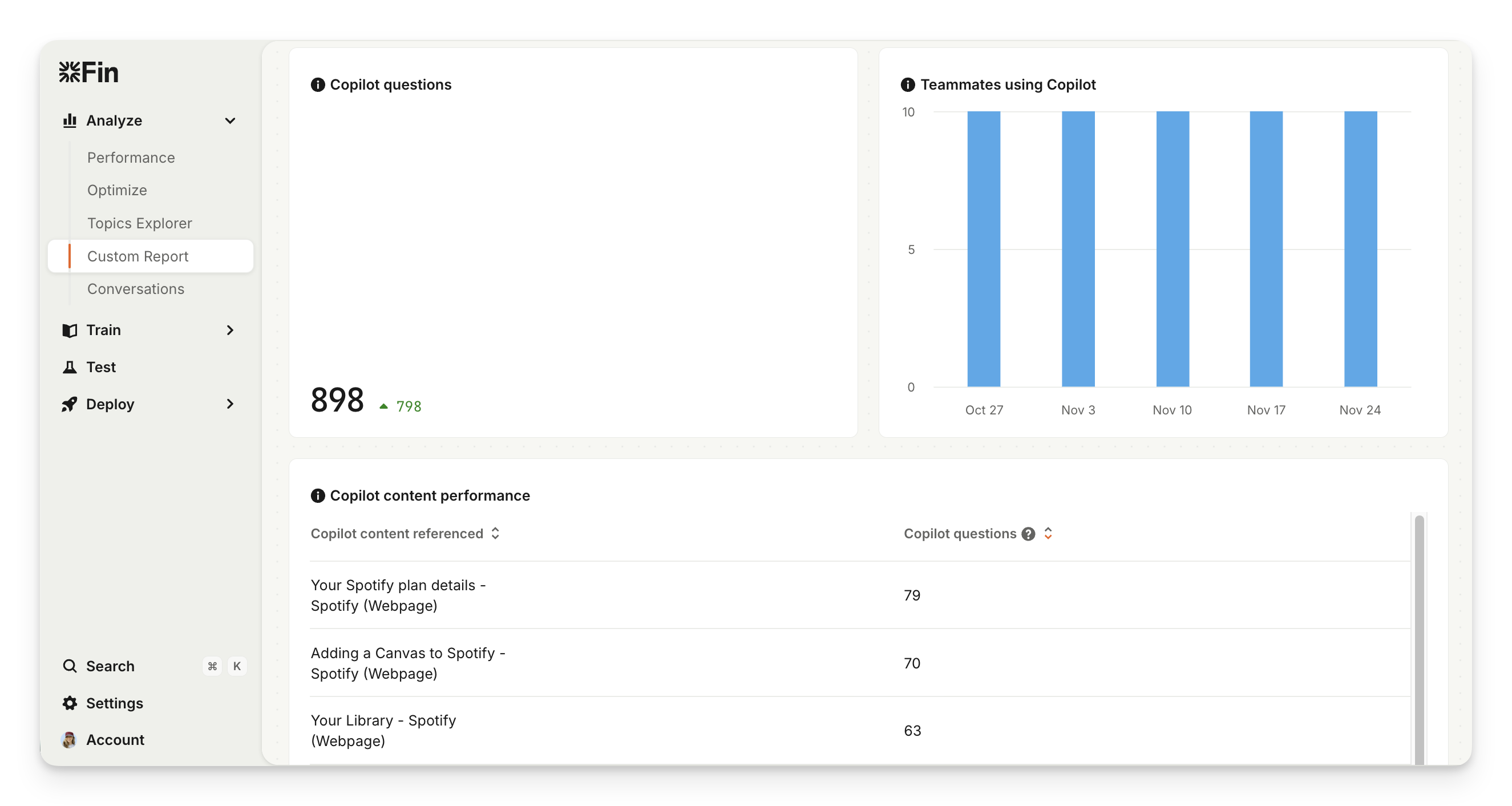 To view Copilot reporting, go to Analyze > Custom Report in Sweo.