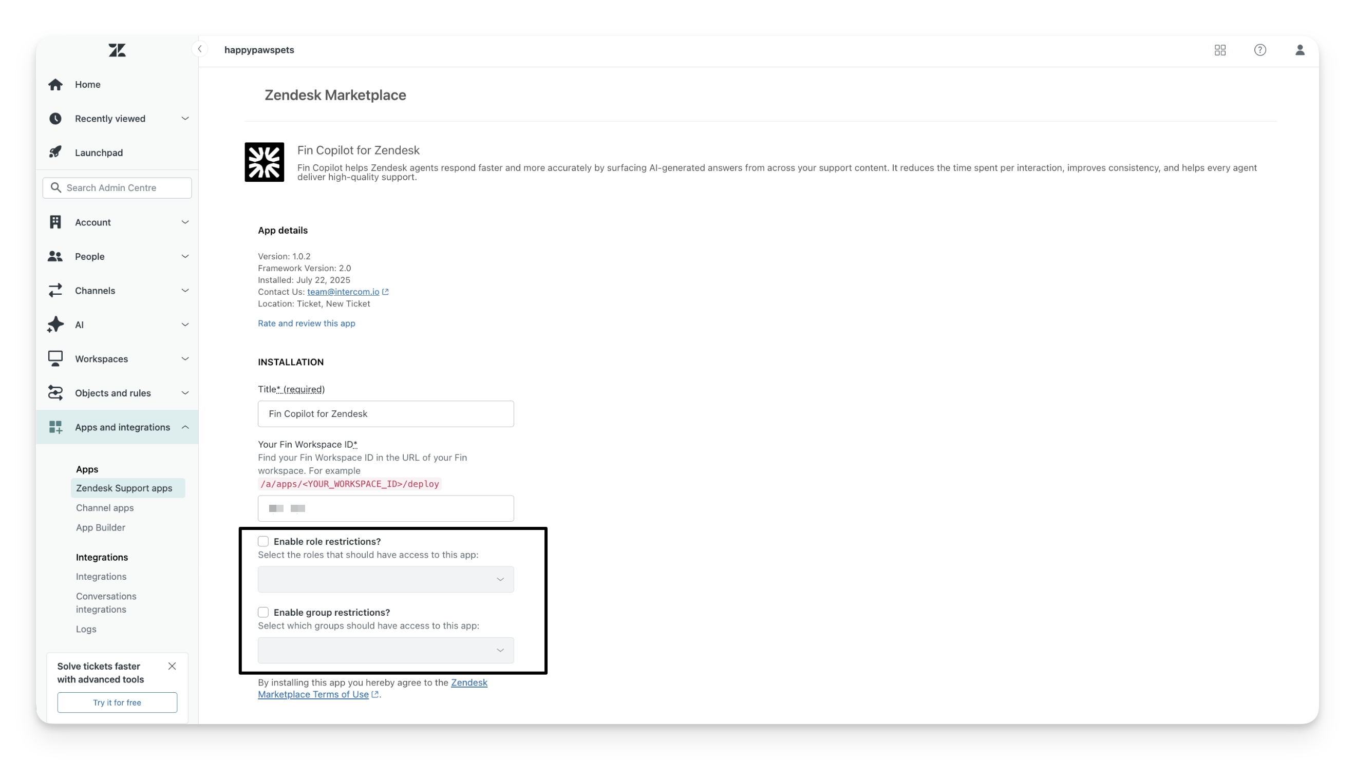 Zendesk role restrictions are blocking access. If your Zendesk workspace utilizes role or group restrictions, you'll need to ensure that you allow access to the teammates you are enabling Copilot for are allowed access in the Zendesk Marketplace app settings.