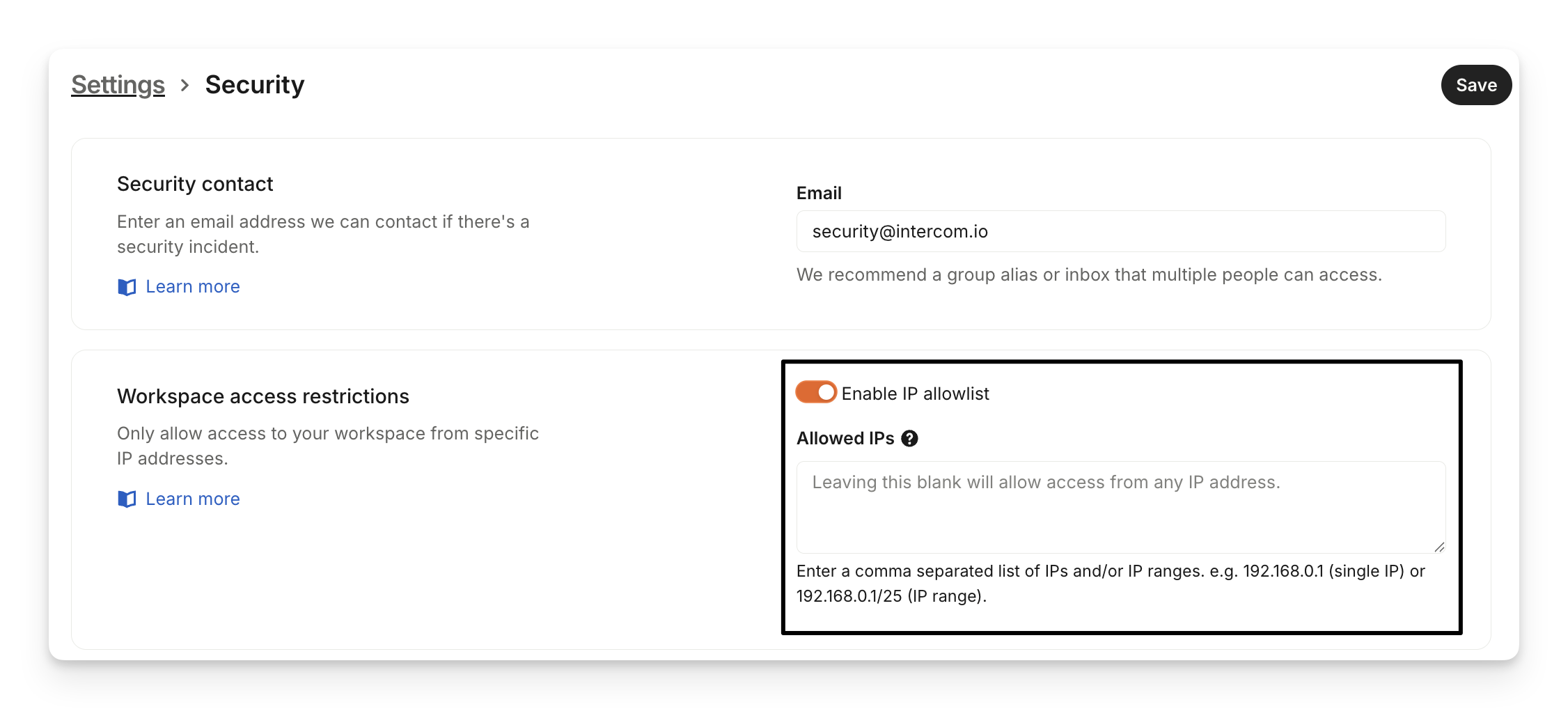 Enter the IP addresses or ranges you wish to allow. We support IPv4 addresses e.g: 192.168.0.1 and CIDR notation for ranges e.g: 192.168.0.1/25. You’ll need to include your current IP address to avoid being locked out.