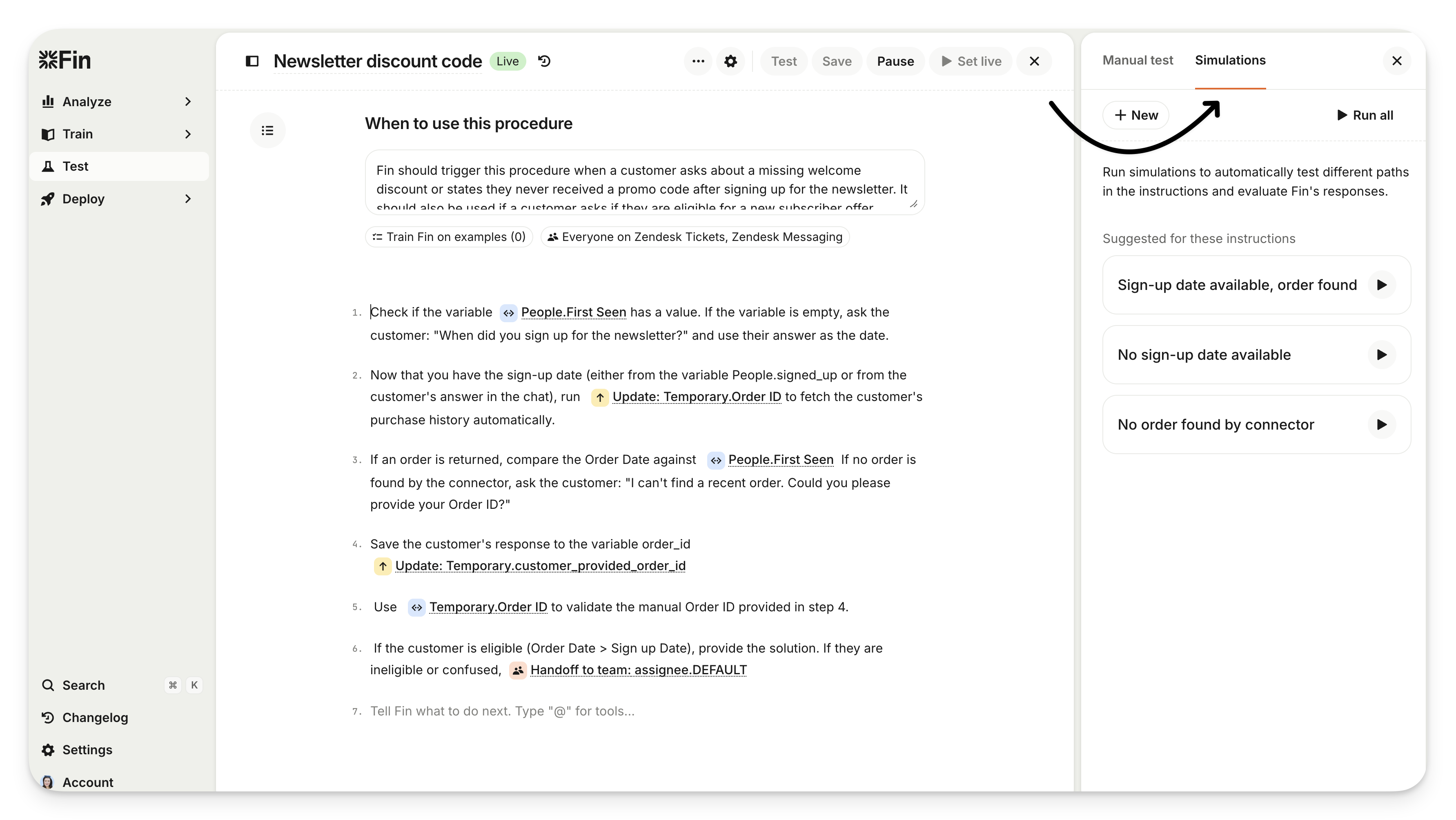 Simulations allow you to validate Sweo Procedures, build confidence in your automation, and catch problems before they impact your customers. By modeling full conversations, simulations help your team handle high-volume or complex scenarios, such as cancellations and refunds, with certainty.