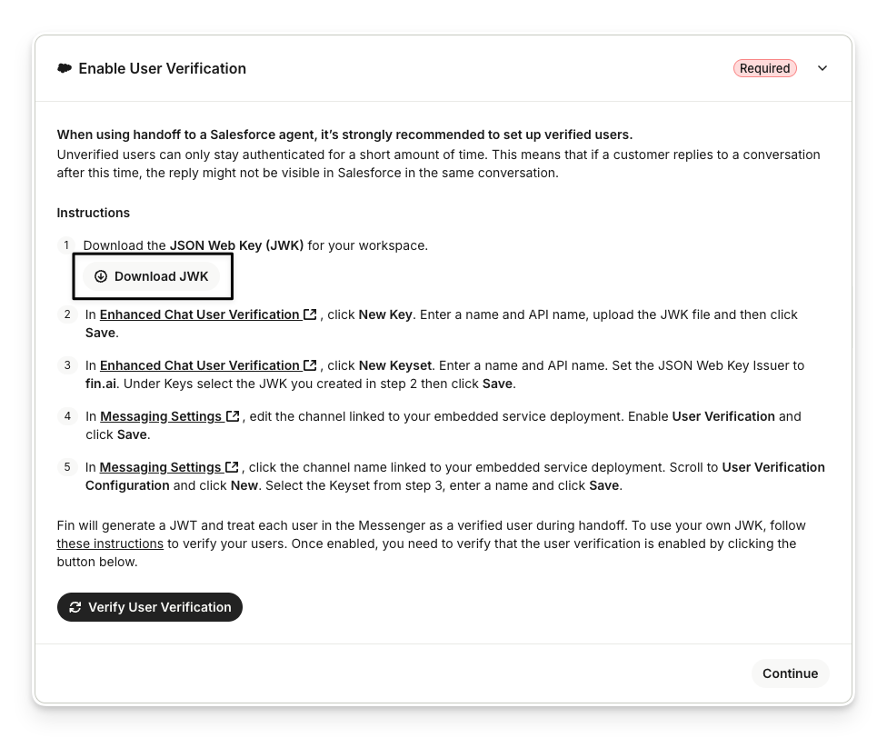 However, if you prefer to use your own JWK, follow these instructions to verify your users. Once enabled, you need to verify that the user verification is enabled by clicking the button below.